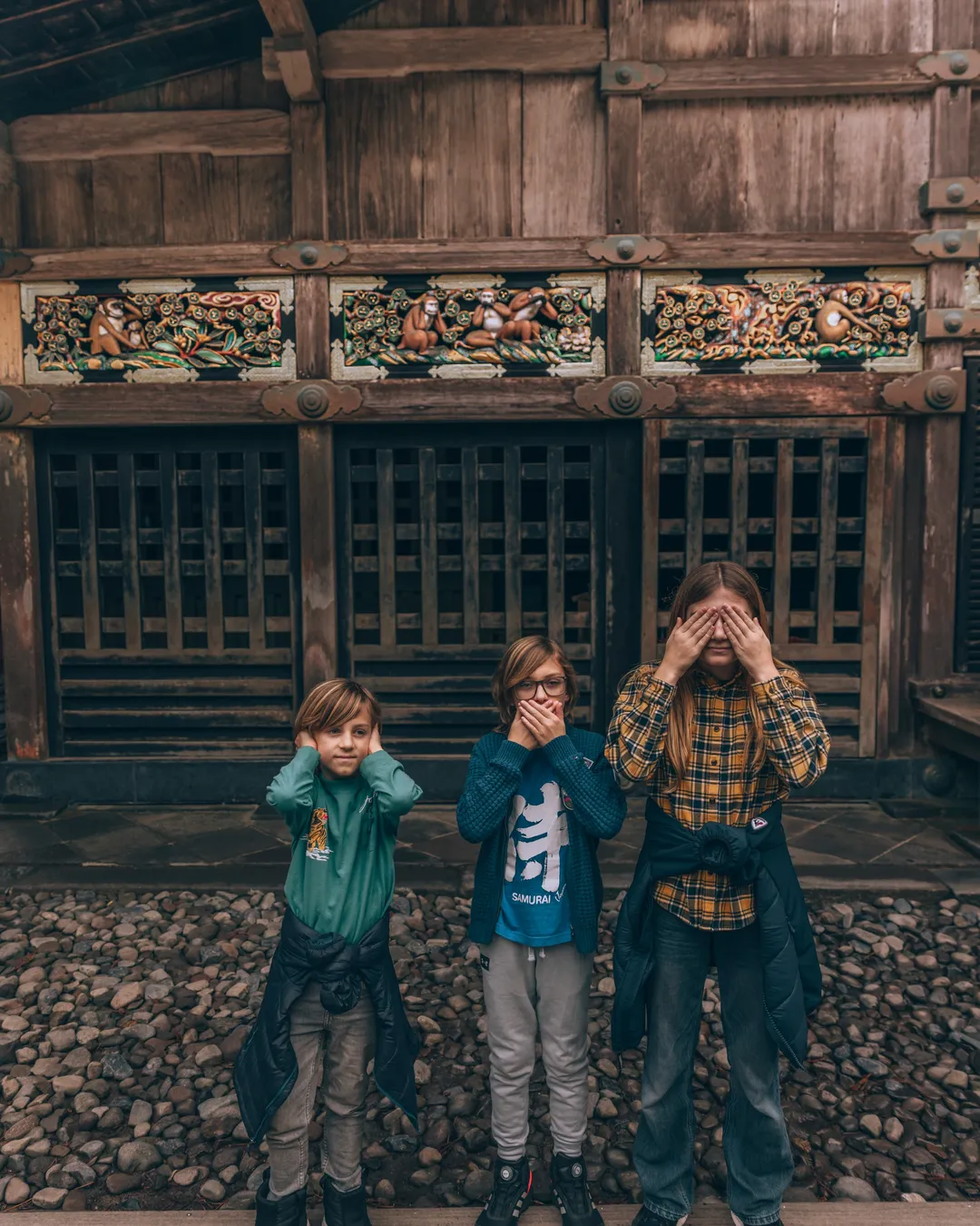 What's cool is how accessible they are - no straining or jostling required. They're right there, part of a whole series of carvings on the stable (including that famous sleeping cat everyone talks about). Mizaru covering his eyes, Kikazaru covering his ears, and Iwazaru covering his mouth - these little guys have been teaching their "see no evil, hear no evil, speak no evil" lesson for centuries.