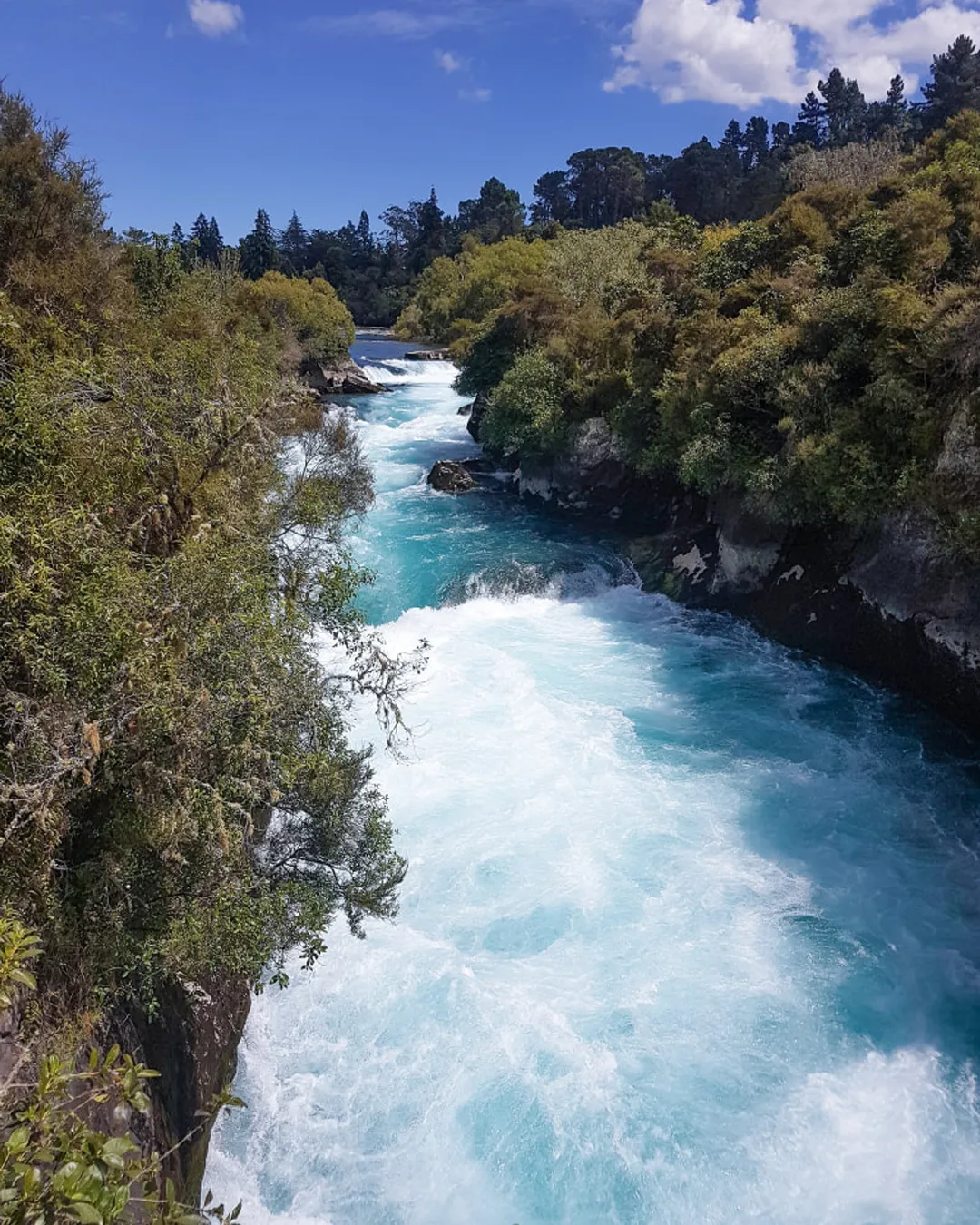 Huka Falls is one of New Zealand's most famous landmarks and for good reason. The Waikato River funnels through a narrow canyon and crashes over the falls with a deafening roar — about 220,000 litres of water thunder through every second which is insane!! It's quite overwhelming to look below and see how powerful it is and just looking at the volume of whitewash makes you want to step back a little from the railing! The platforms are easy to reach from the car park and it's a short walk that’s good for all ages and fitness levels. From the platforms you can watch the river surge through, crashing over the 11-meter drop, and swirling wildly in the pool below.