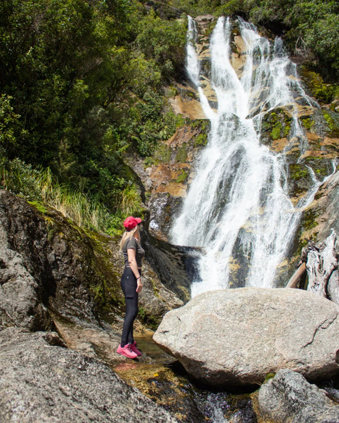 Carew Creek Falls is a 30-meter waterfall near Lake Brunner on the West Coast. The water flows over large granite rocks and it is actually a lot bigger than it looks captured in photos! There is a big pool at the base of the falls and then the water continues down more boulders. Take a look behind you at the waterfall too as it's a really nice view across country on a clear day.