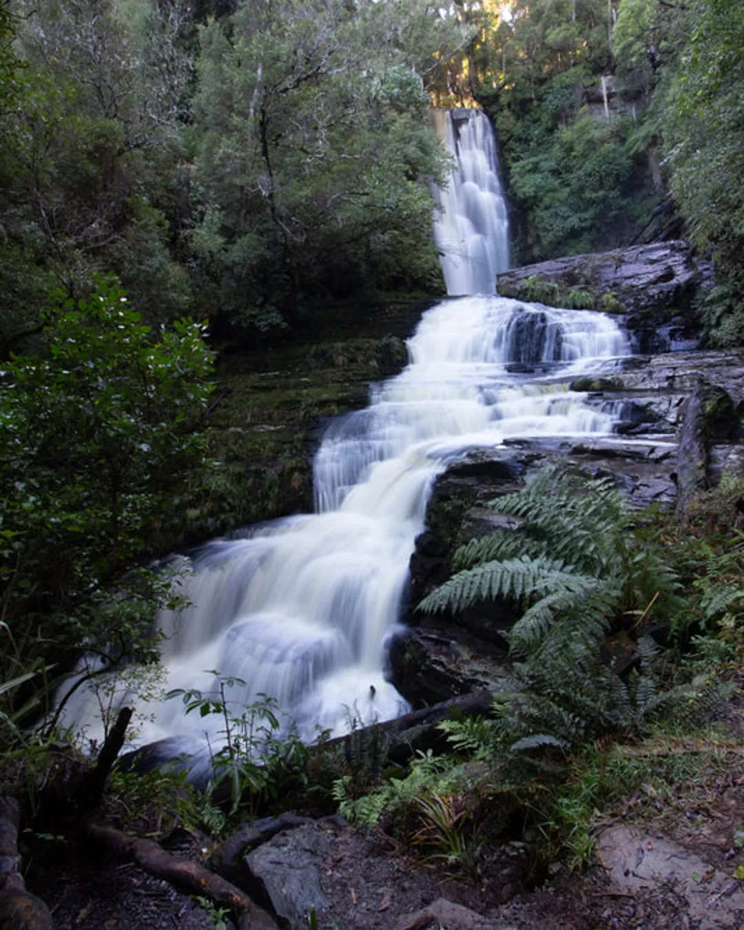 The track to the falls is about 20 minutes return and takes you through typical Catlins bush — lots of green, moss, tree roots and a few scattered boulders. It finishes with a short set of stairs down to the viewing platform where you get the full view of the falls head-on. Easy walk, solid payoff!