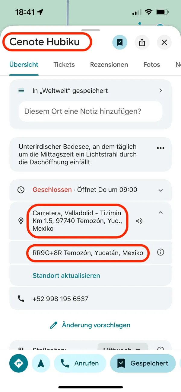 Füge den Namen, Adresse oder Plus-Code einfach unter "Place" ein und wähle die Location aus.
