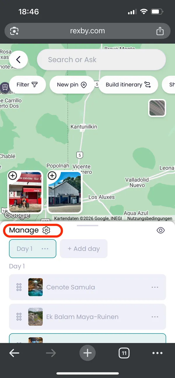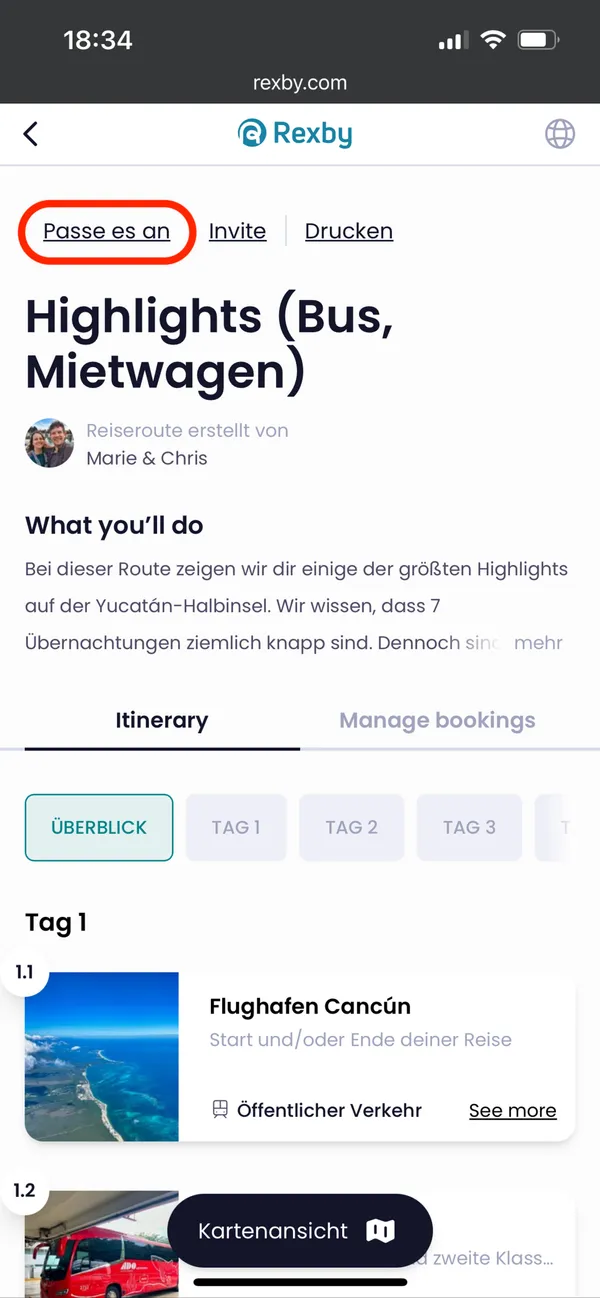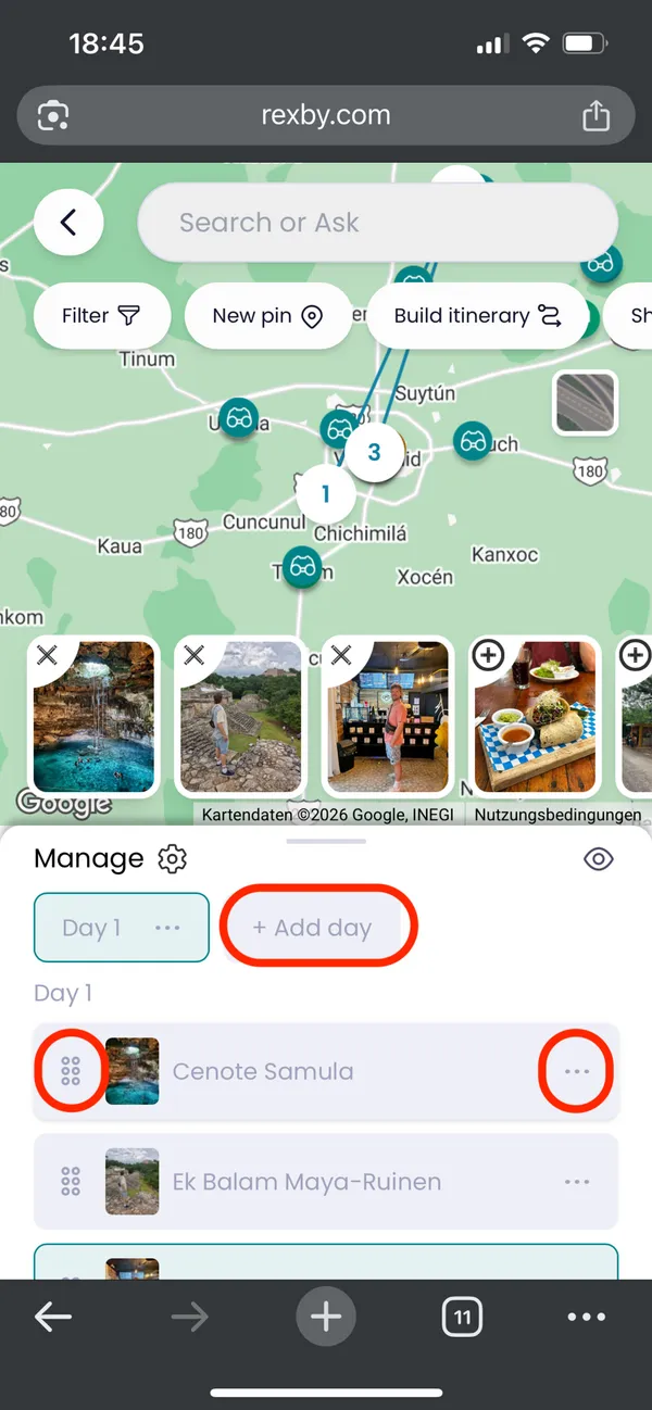 Du kannst die Stopps deiner Route per Drag & Drop verschieben, weitere Tage hinzufügen oder über die drei Punkte auch wieder komplett löschen.