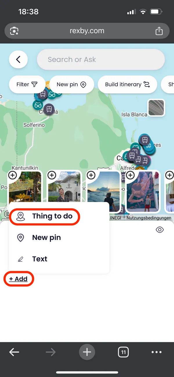 Du kannst auch auf "Add" und dann "Thing to do" klicken, um über eine Textsuche in all unseren Empfehlungen zu suchen. Wir finden die Karte aber deutlich praktischer.