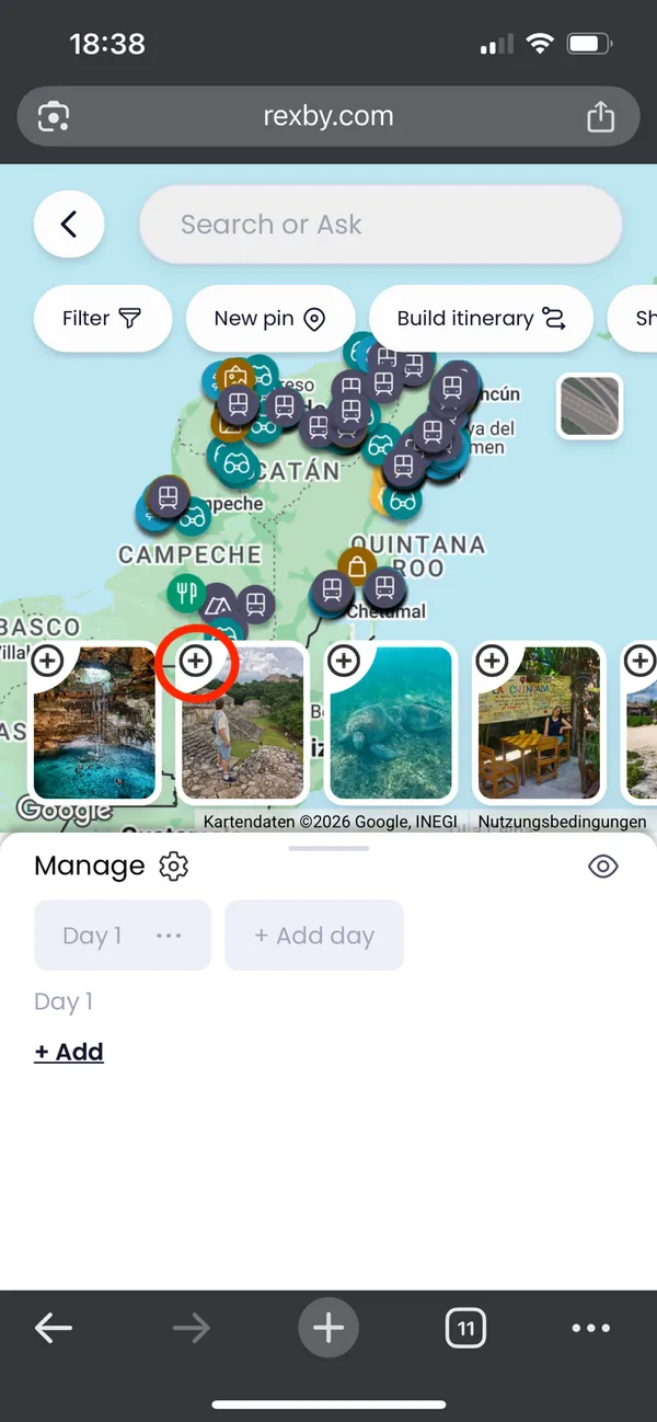 Jetzt bist du im Routenplaner und kannst einzelne Stopps hinzufügen. Wir empfehlen dir, die Stopps über die Karte hinzuzufügen. Du kannst dafür wieder in die Karte gehen und alle Stopps mit einem "+" markieren, die du hinzufügen möchtest.