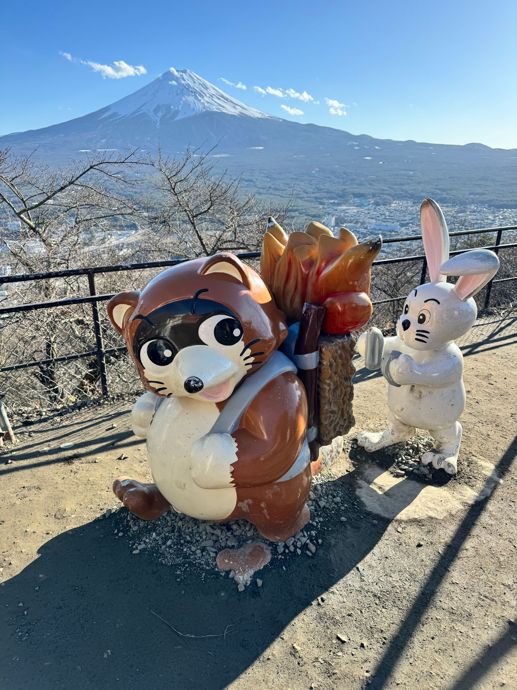 The summit area of Tenjosan is home to the Kachi Kachi Yama Ropeway station, various observation points, and folklore-themed statues of a tanuki and rabbit.