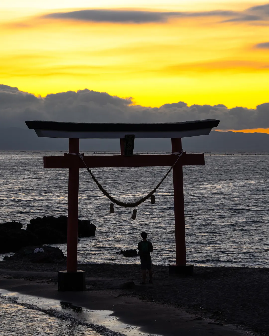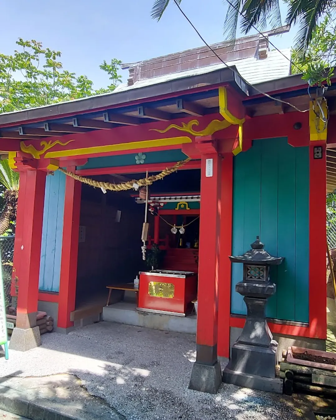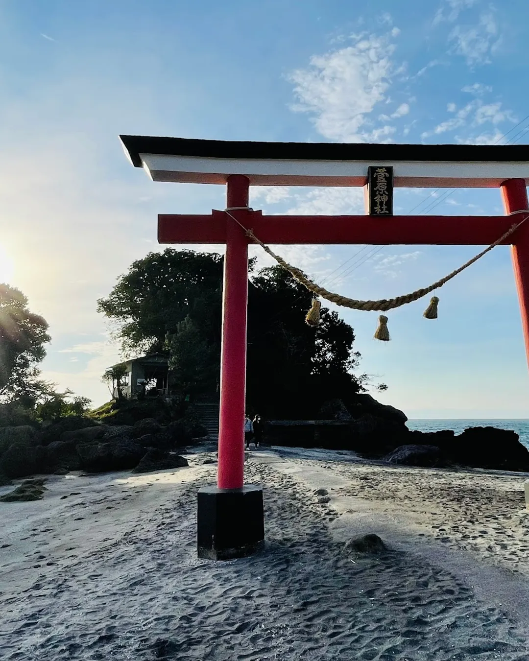 Sugahara Shrine sits on a small island, and during high tide, the path to the main hall is submerged, making it inaccessible. The main hall is perched on a rocky outcrop, with visitors needing to climb steep stairs using a rope for support.