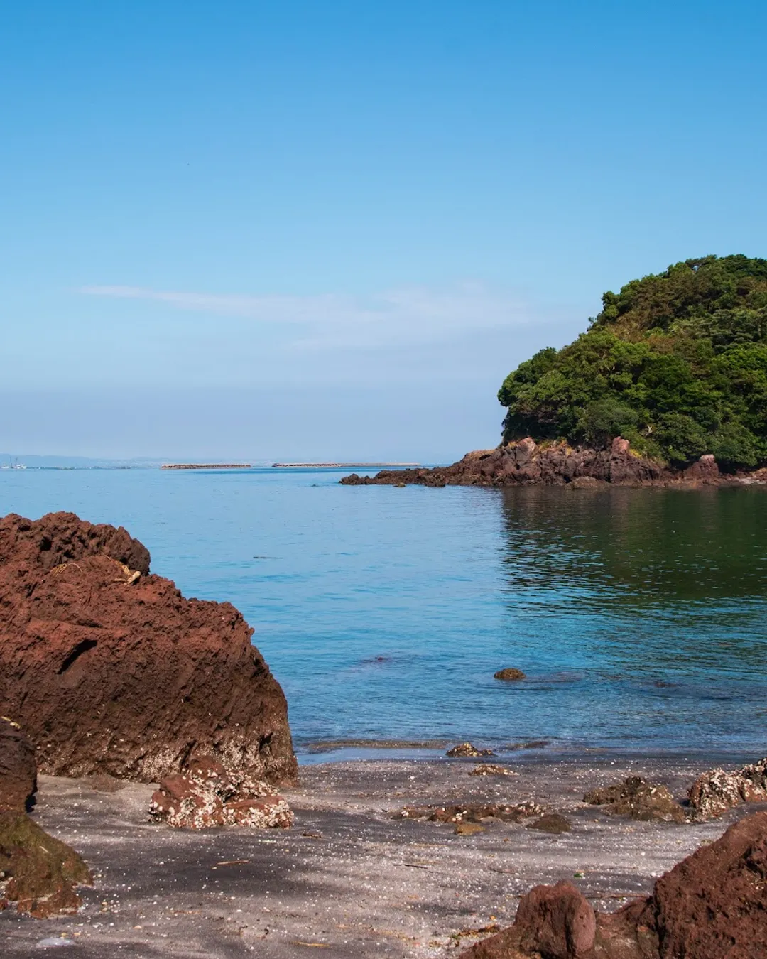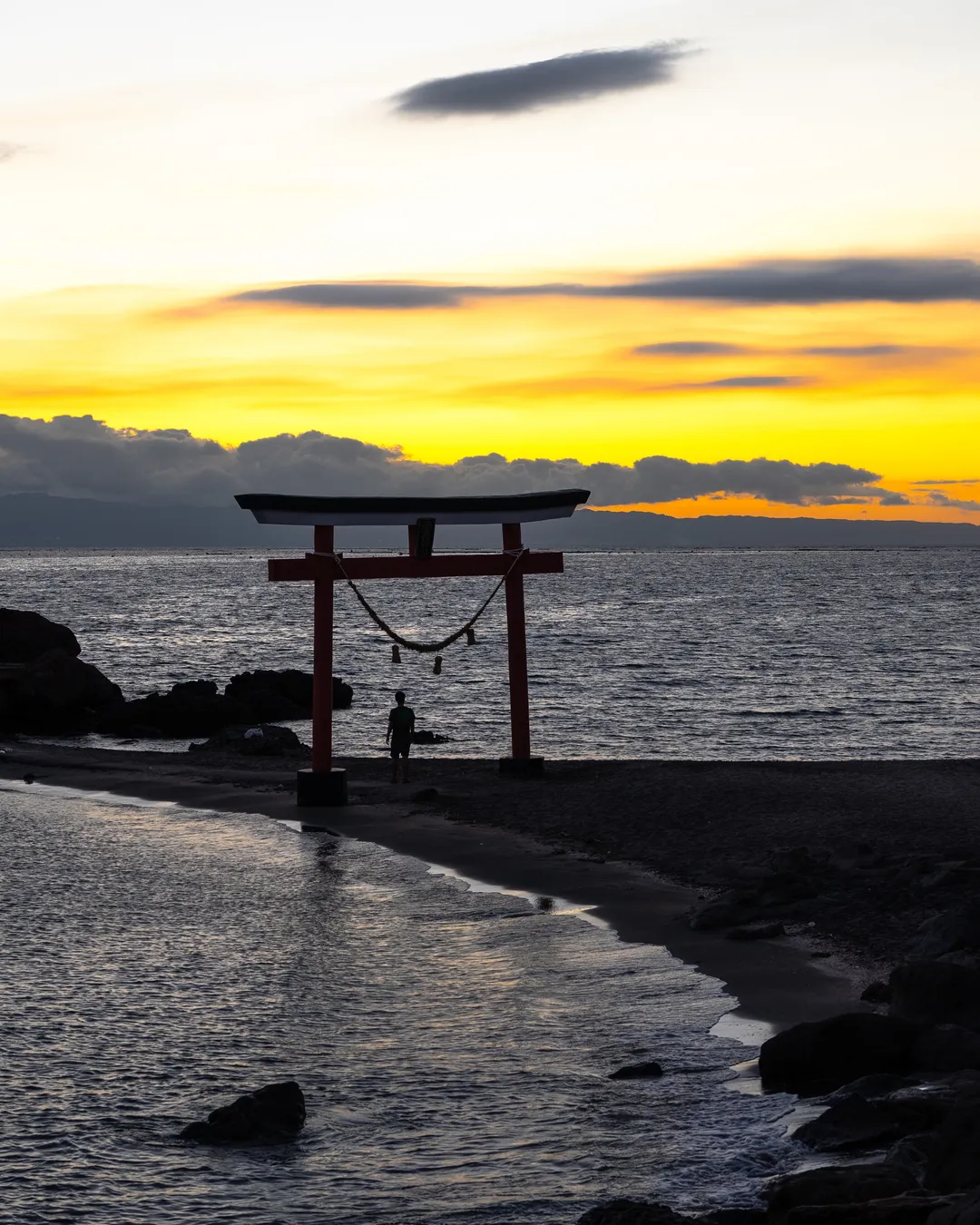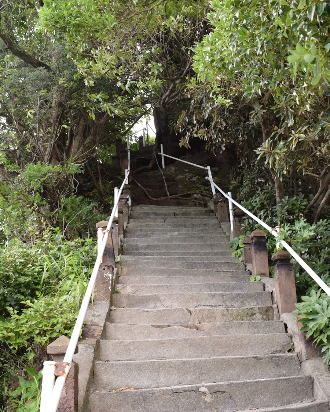 Sugahara Shrine sits on a small island, and during high tide, the path to the main hall is submerged, making it inaccessible. The main hall is perched on a rocky outcrop, with visitors needing to climb steep stairs using a rope for support.