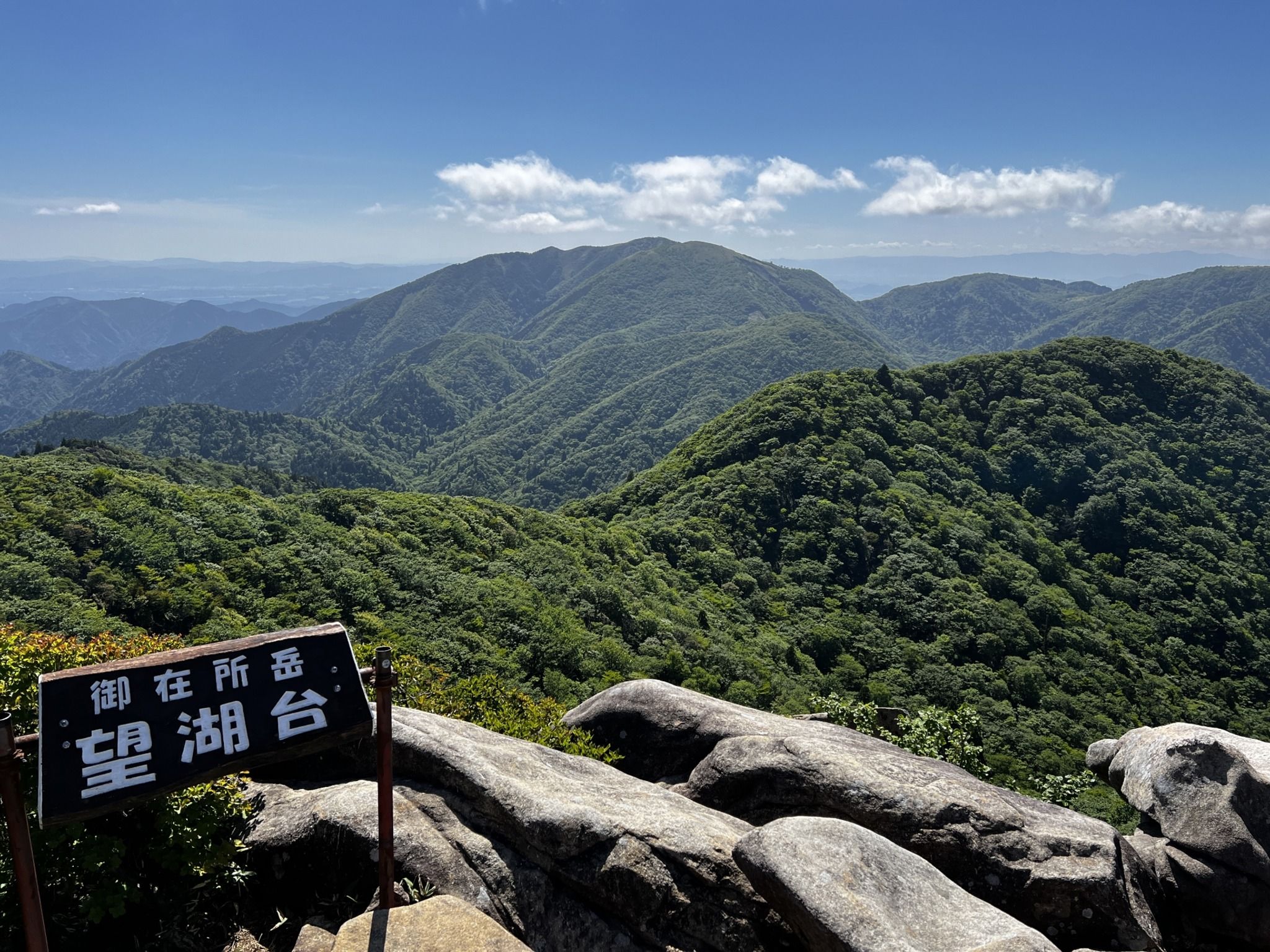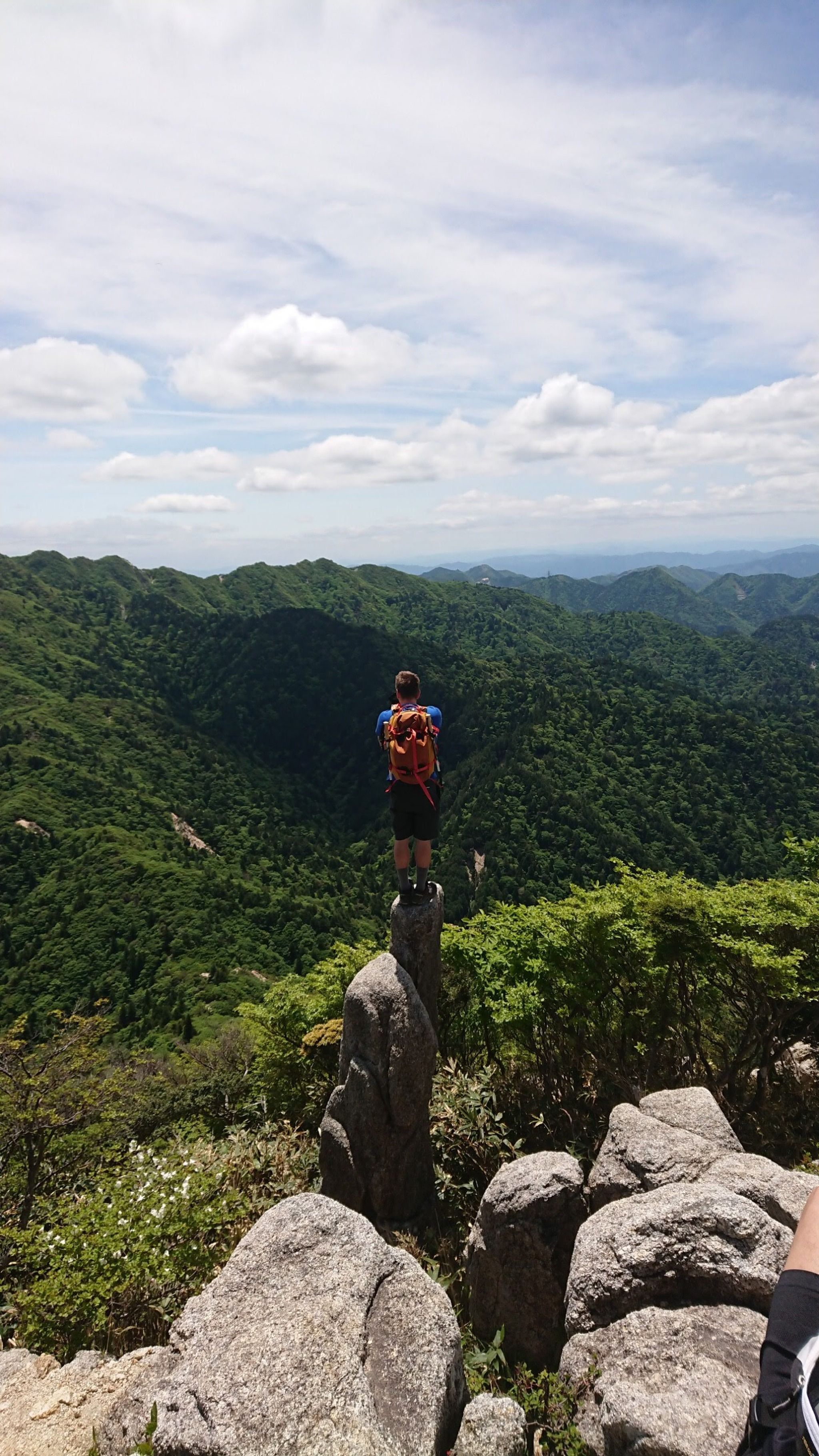 This trail begins about two minutes from the Gozaisho Ropeway base station. It is a well-known beginner-friendly route. As you walk along the valley, you'll pass through serene forested areas with a rest stop at Tounai Hut. From there, you continue along a more open path, eventually reaching the iconic rock formation known as Rabbit Ears Rock (兎の耳), which resembles a rabbit’s face. The trail gets steeper as you ascend the ridgeline, providing occasional open views of the valleys below. Upon reaching Kunimi Pass, the summit of Mount Gozaisho is within sight.
