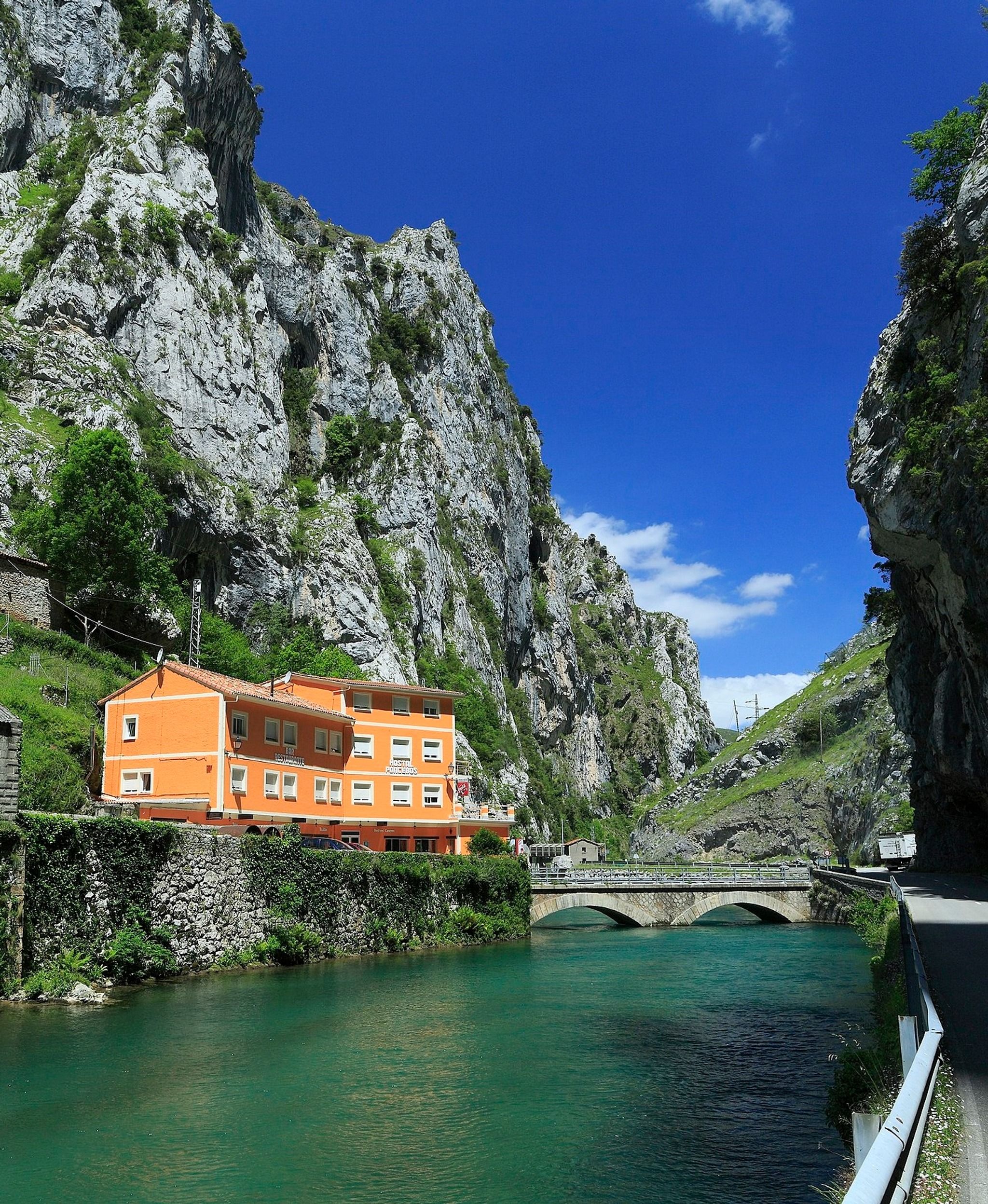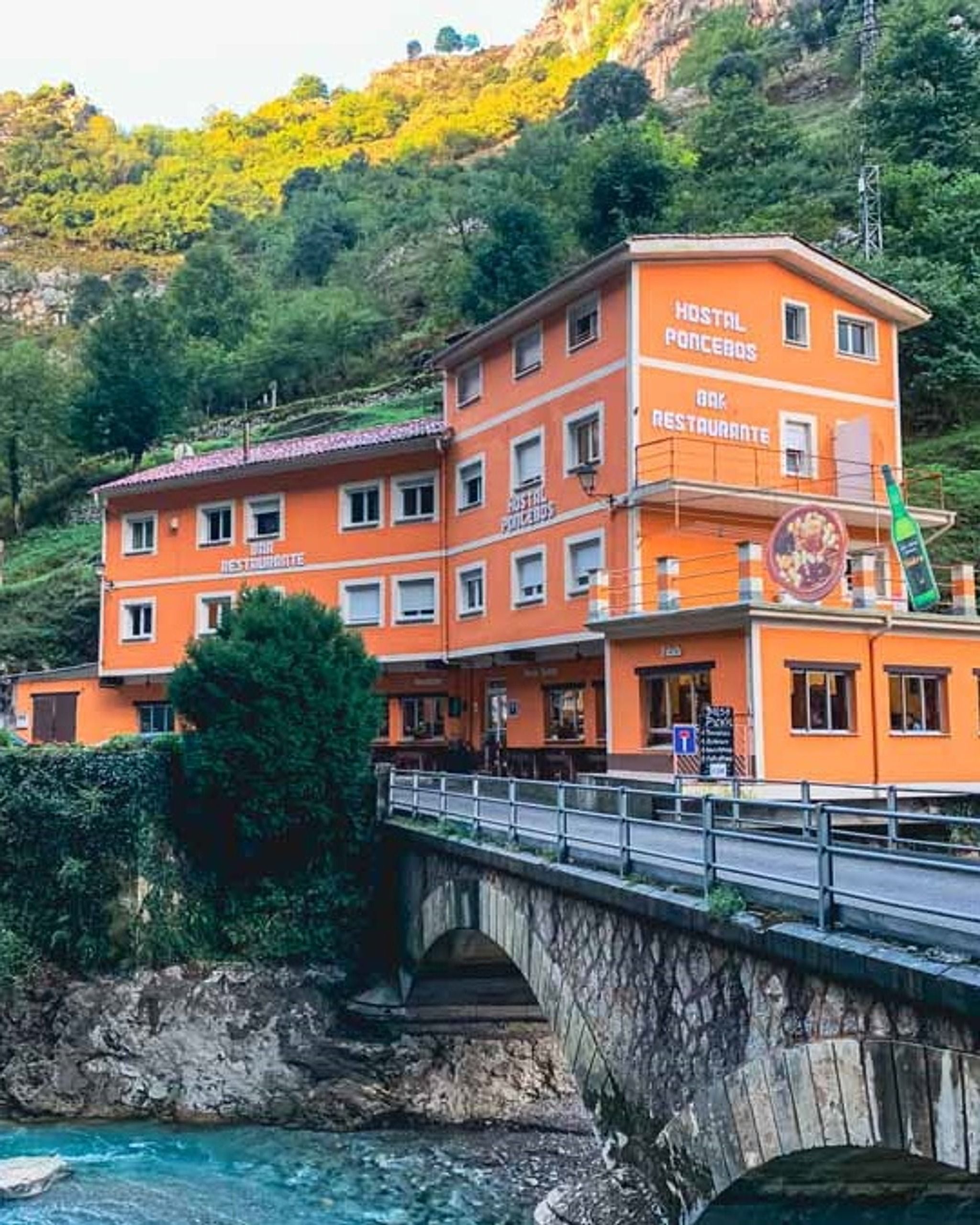 🏨✨ Hostal Poncebos is located just 500 meters from the Bulnes funicular. Situated along the Cares Route in the Picos de Europa National Park, its rooms offer free Wi-Fi and stunning views of the Cares River and the mountains. 🌄🌊