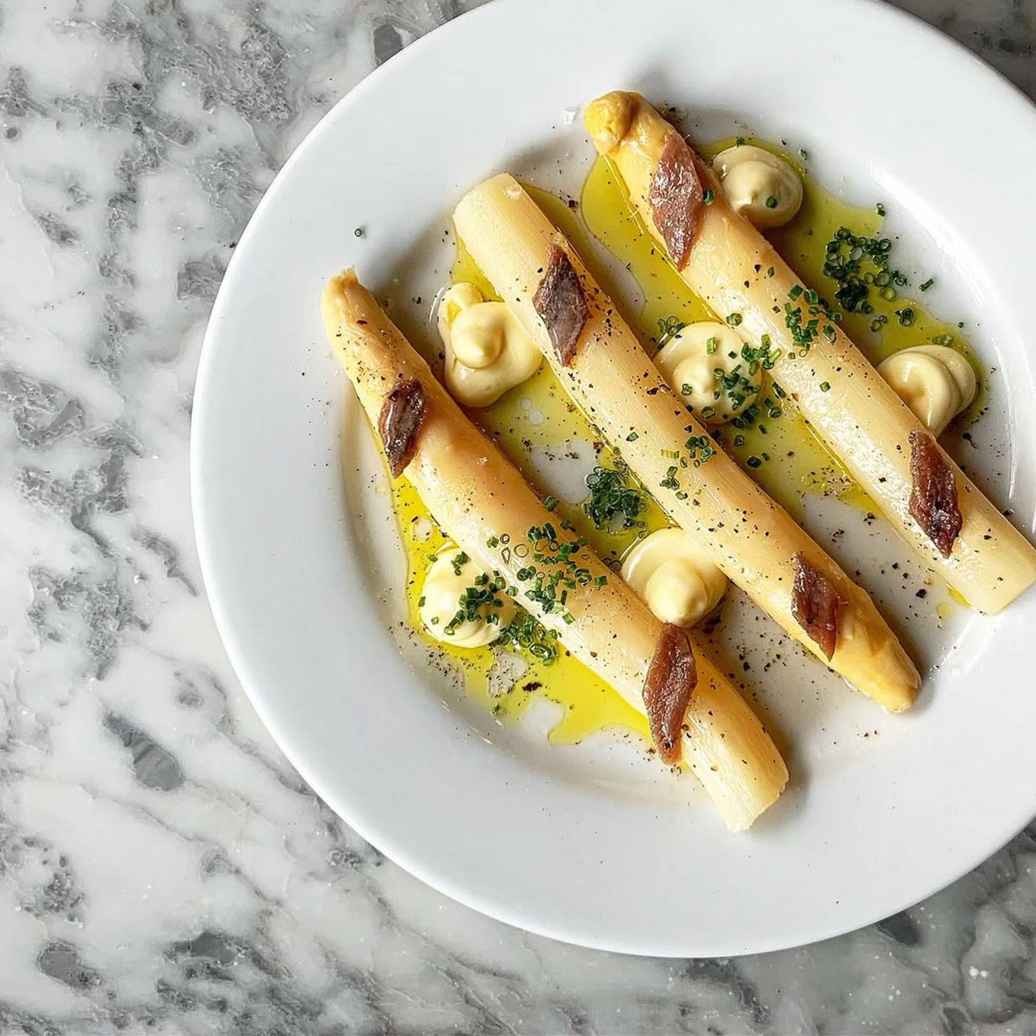 🐟 Espárragos Blancos con Anchoas: White asparagus topped with salty anchovies and a tangy finish.