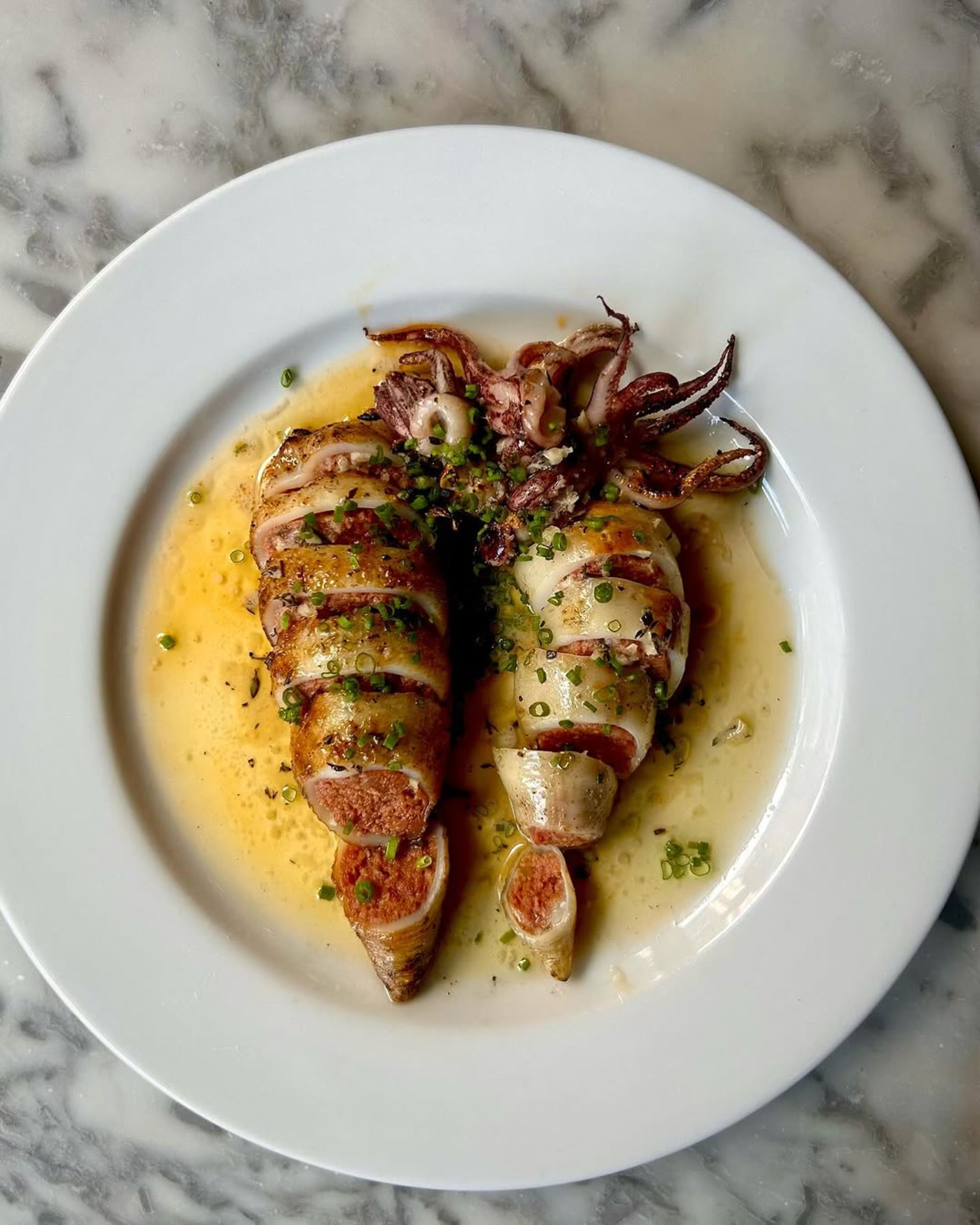 🦑 Ensalada de Calamar: Tender squid with a silky texture, balanced with bright chive and moscatel vinegar.