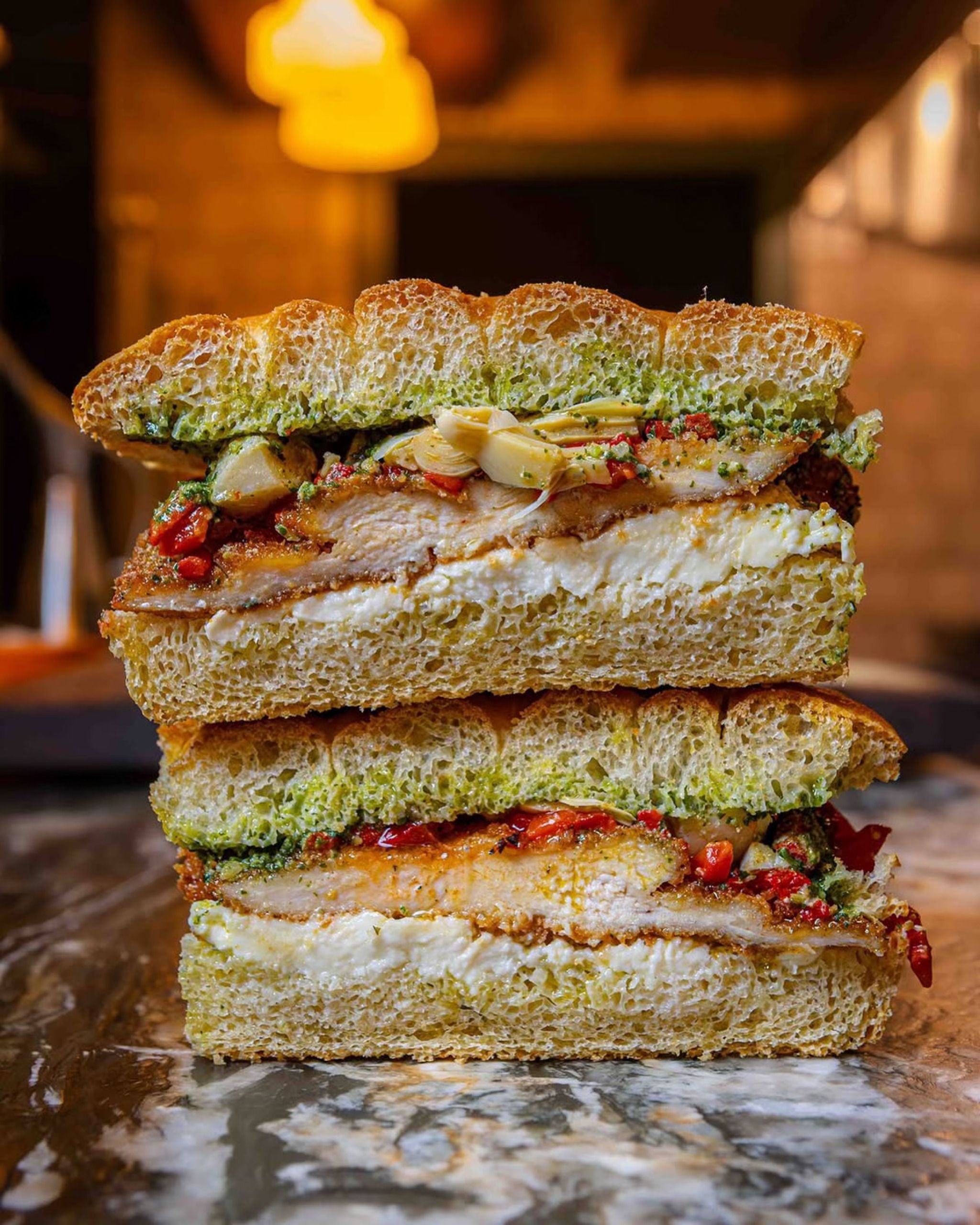 Chicken Milanese: Pesto, a perfectly fried chicken cutlet, and sweet peppers. Sweet meets savory in the best way.