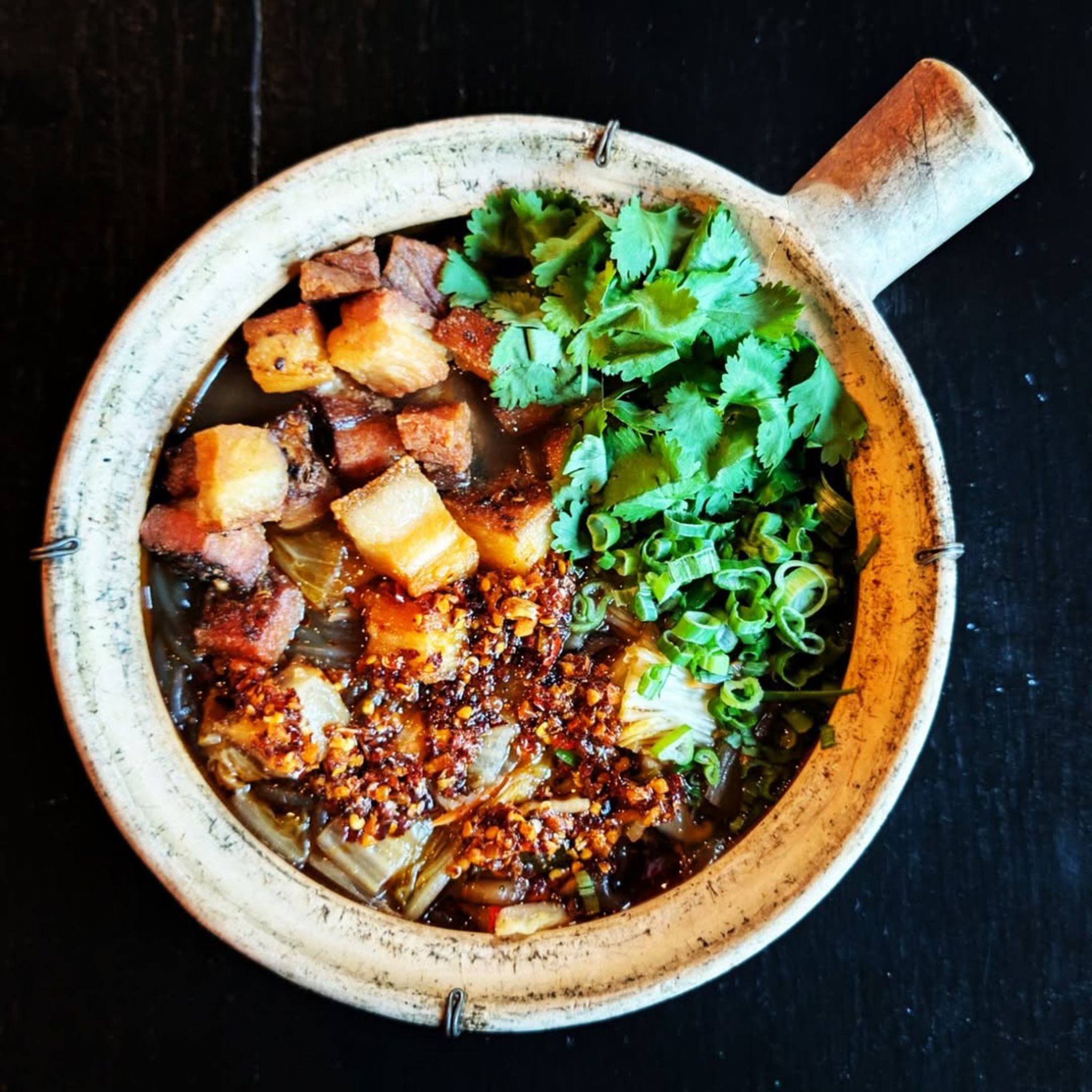🥟 Crescent Dumplings – Pork dumplings swimming in soy, chili oil, and cilantro. Spicy, savory, and incredibly addictive.