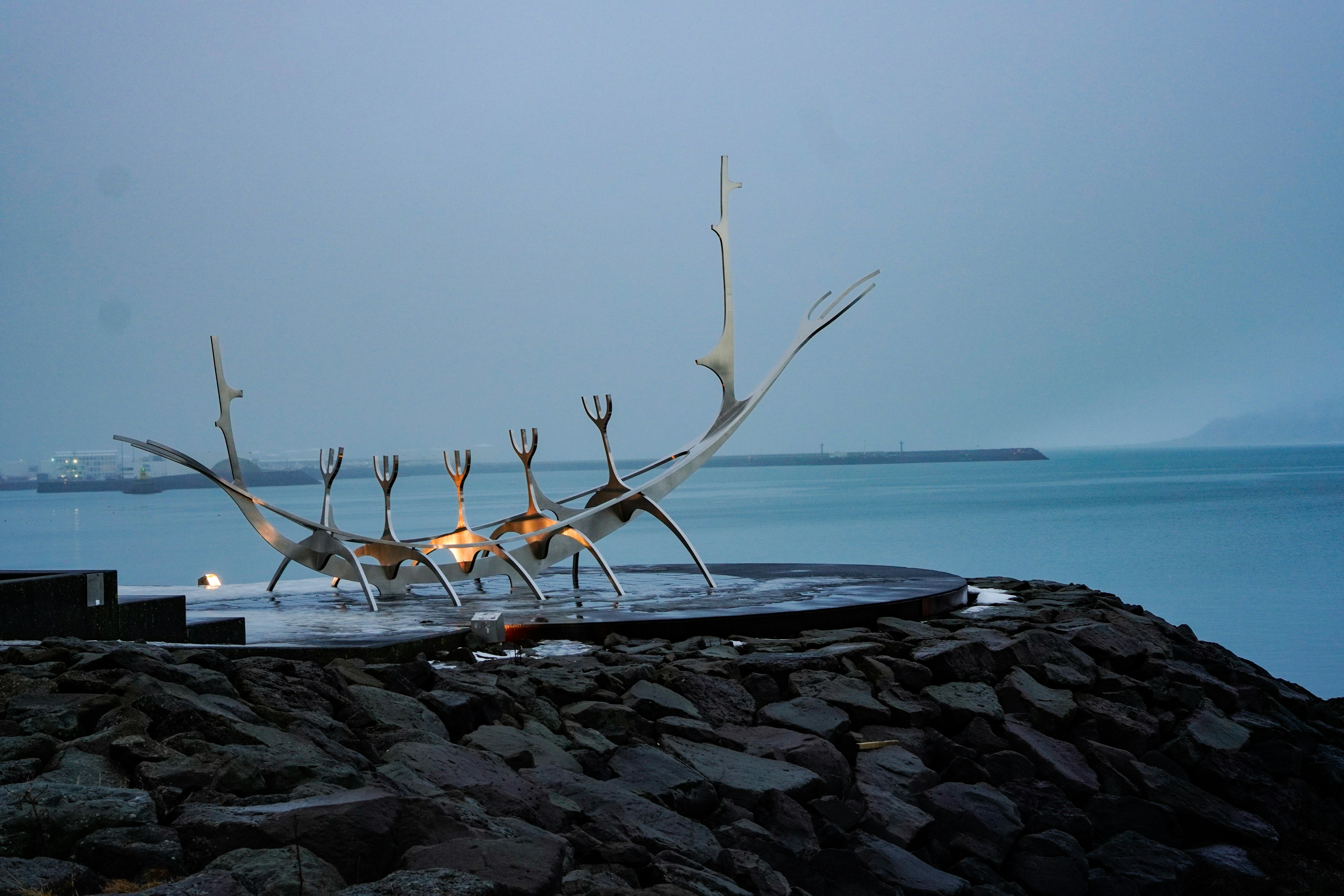 Viking ship sculpture on the water
