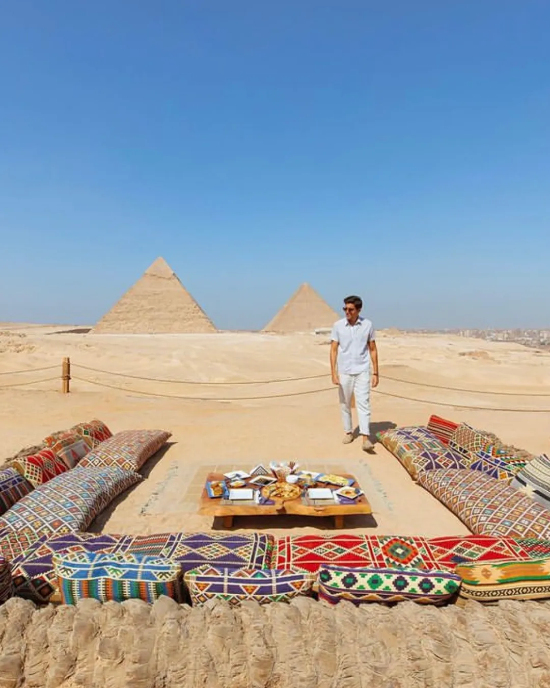 🇬🇧 I had this restaurant on my bucket list since it opened but unfortunately I took it too late to book (2 months in advance though). If you want to go there too, remember to book as soon as possible by phone only at +21212299999 (the staff speaks English or Arabic). They offer full breakfasts, lunches and dinners for an affordable price, and you can also see their menu on their Instagram account: @9pyramidslounge (prices displayed in Egyptian pounds). From the entrance of the pyramids, you will have to walk about 30 to 40 minutes to get there (10 minutes from the photo spot of my guide) so do not forget to take water with you.