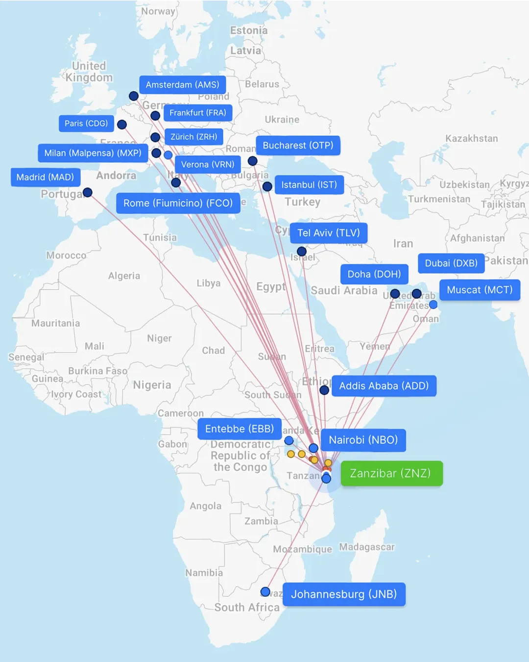 There are quite a few airlines offering direct flights to Zanzibar. One of the most popular ones are - AirFrance, KLM, flydubai, and Turkish Airlines. I have also put together a map with the current direct flight routes to Zanzibar to help you plan your visit more easily. There are no direct flights from the U.S. to Zanzibar, so you'll typically have one or two layovers.