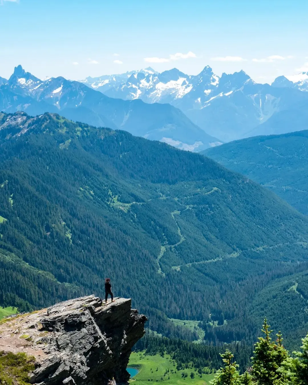 Summit ridge offers 360° views: look north to the Fraser Valley, east to Mount Baker, south to Lady Peak, and west to Jones and Christina Lakes.