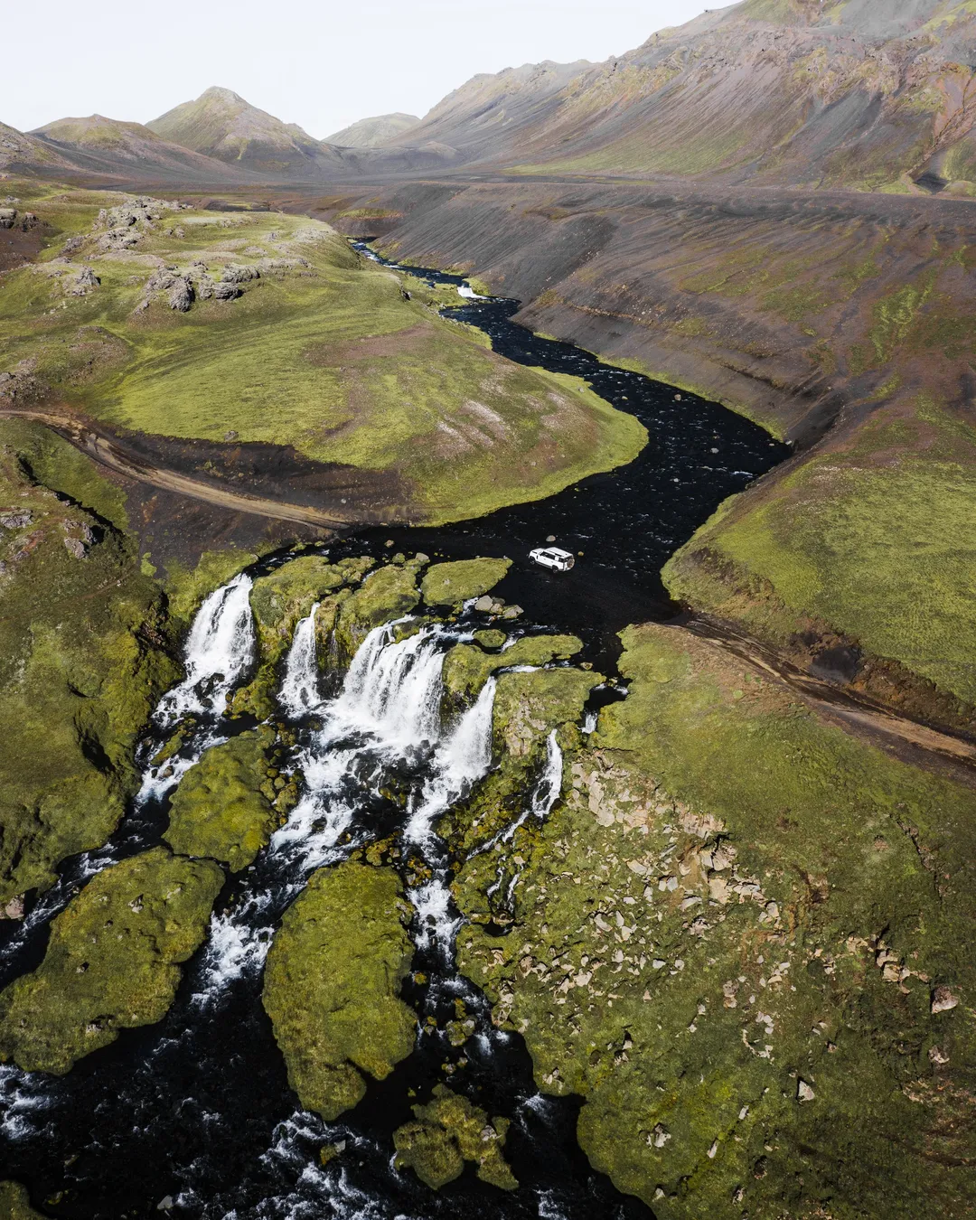 Approach is only possible in high-clearance 4x4 vehicles during the summer months, and the river must be assessed before crossing, it can be strong after rainfall or glacial melt. The crossing is wide, shallow, and scenic, with the river splitting and tumbling into a dramatic green canyon right after the fording point.