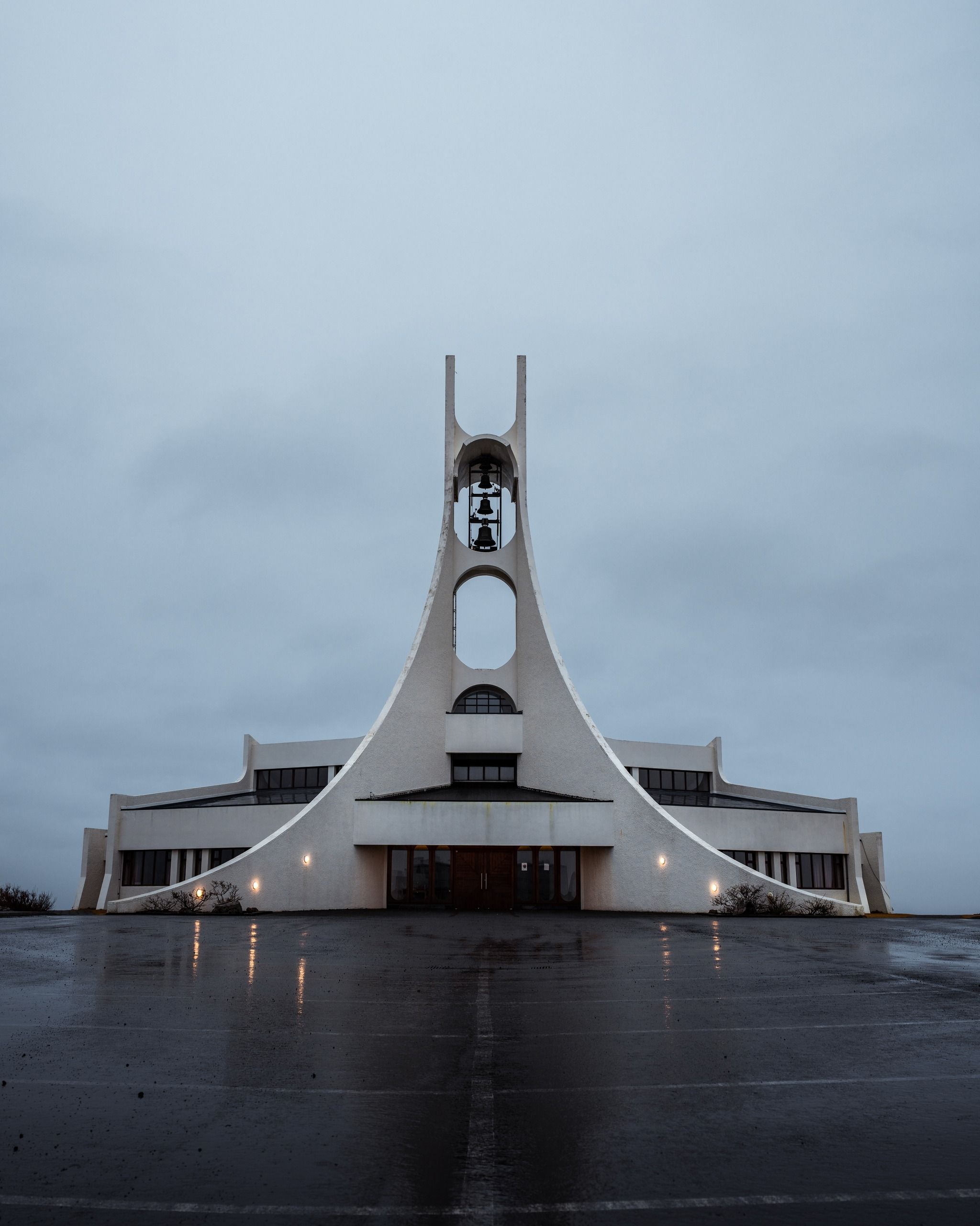 Modernist white church with sweeping ocean views