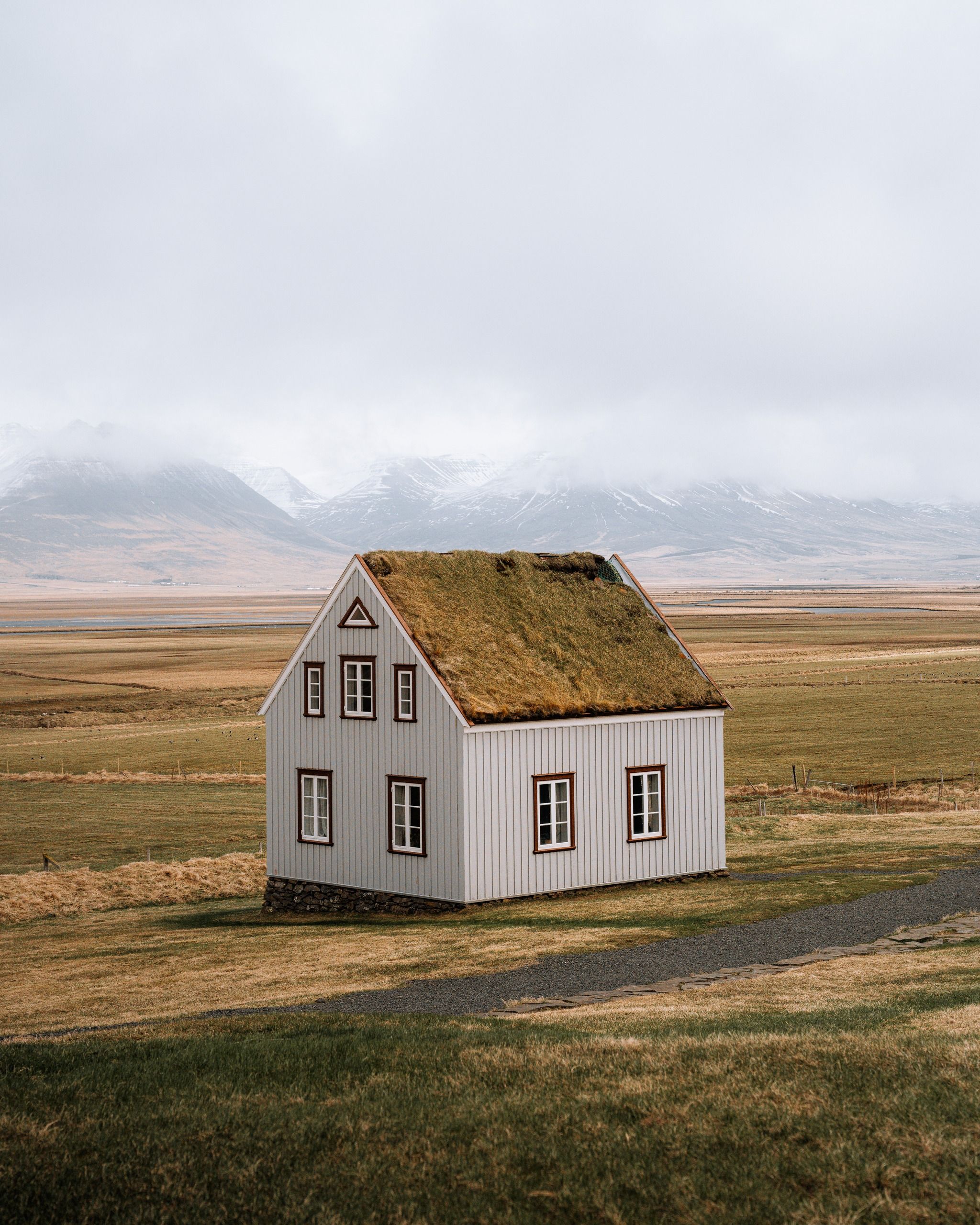 Capture the contrast between ancient turf construction and Icelandic nature, details in the buildings as well as the interiors