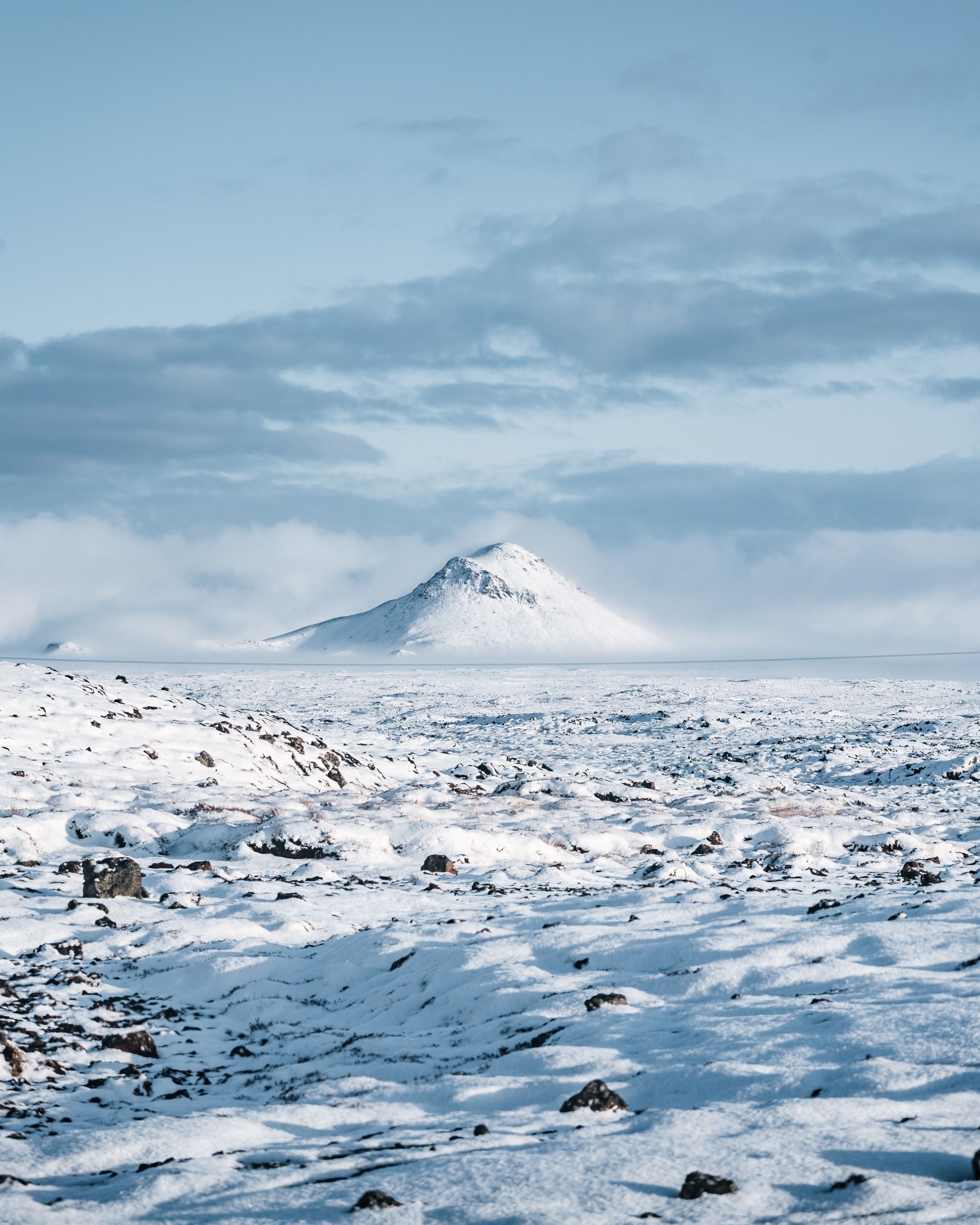 Sunrise or sunset for dramatic light and shadows across the lava fields. Golden hour enhances the pyramid shape and isolation of the peak.