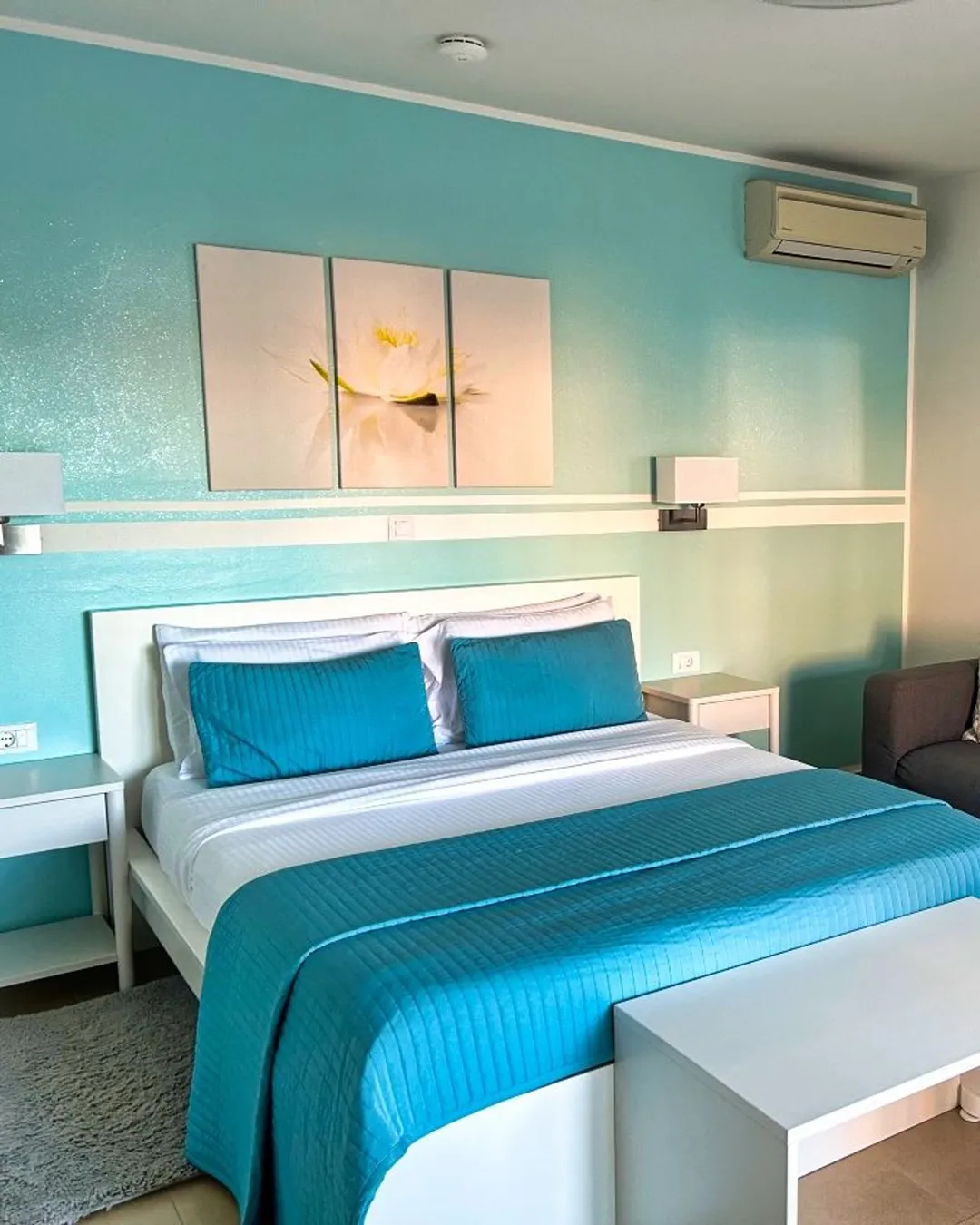 Das Apartment war gut ausgestattet, hatte ein bequemes Bett und einen großen Balkon. Besonders gefallen hat uns das maritime Design.