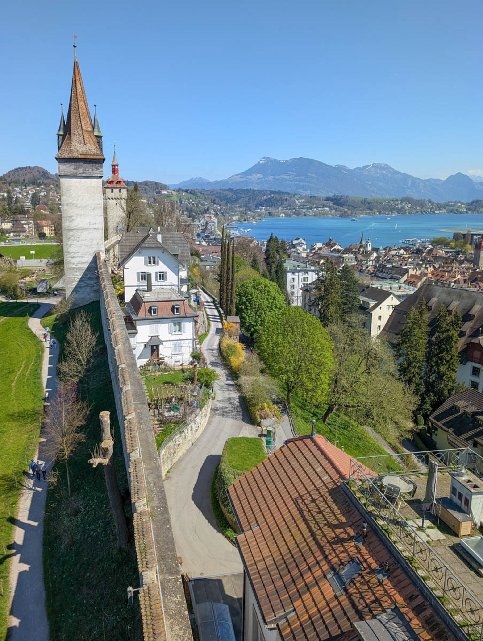 The "Museggmauer" is a preserved section of the old city wall that surrounded and protected Lucerne city in the 13th century. This wall is on a hill just above the Lucerne old town district, easily accessible by foot.