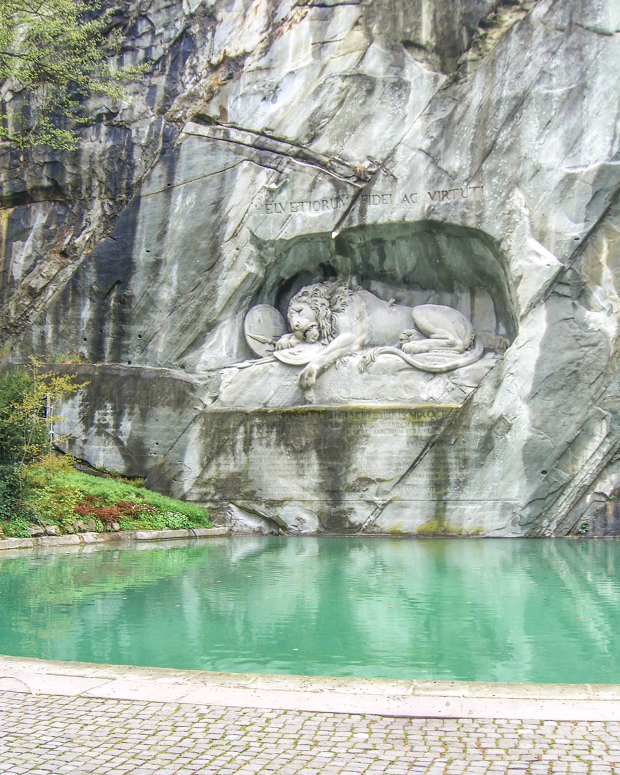 The Lion Monument is a large sculpture carved into a stone wall depicting a dying lion. It pays tribute to Swiss guards who died protecting the life of King Louis XVI during the French Revolution.