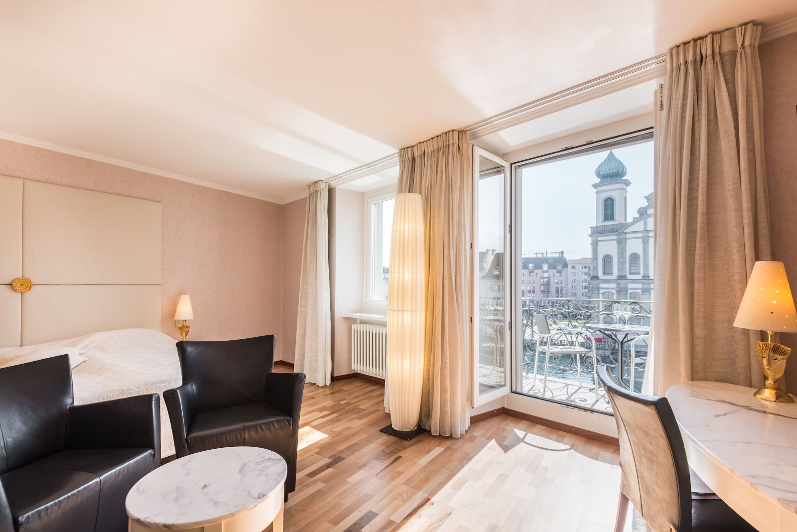 The newly renovated rooms and suites offer stunning views of the iconic Chapel Bridge, Jesuit Church, and Mount Pilatus. They have family rooms that can accommodate up to 4 people.