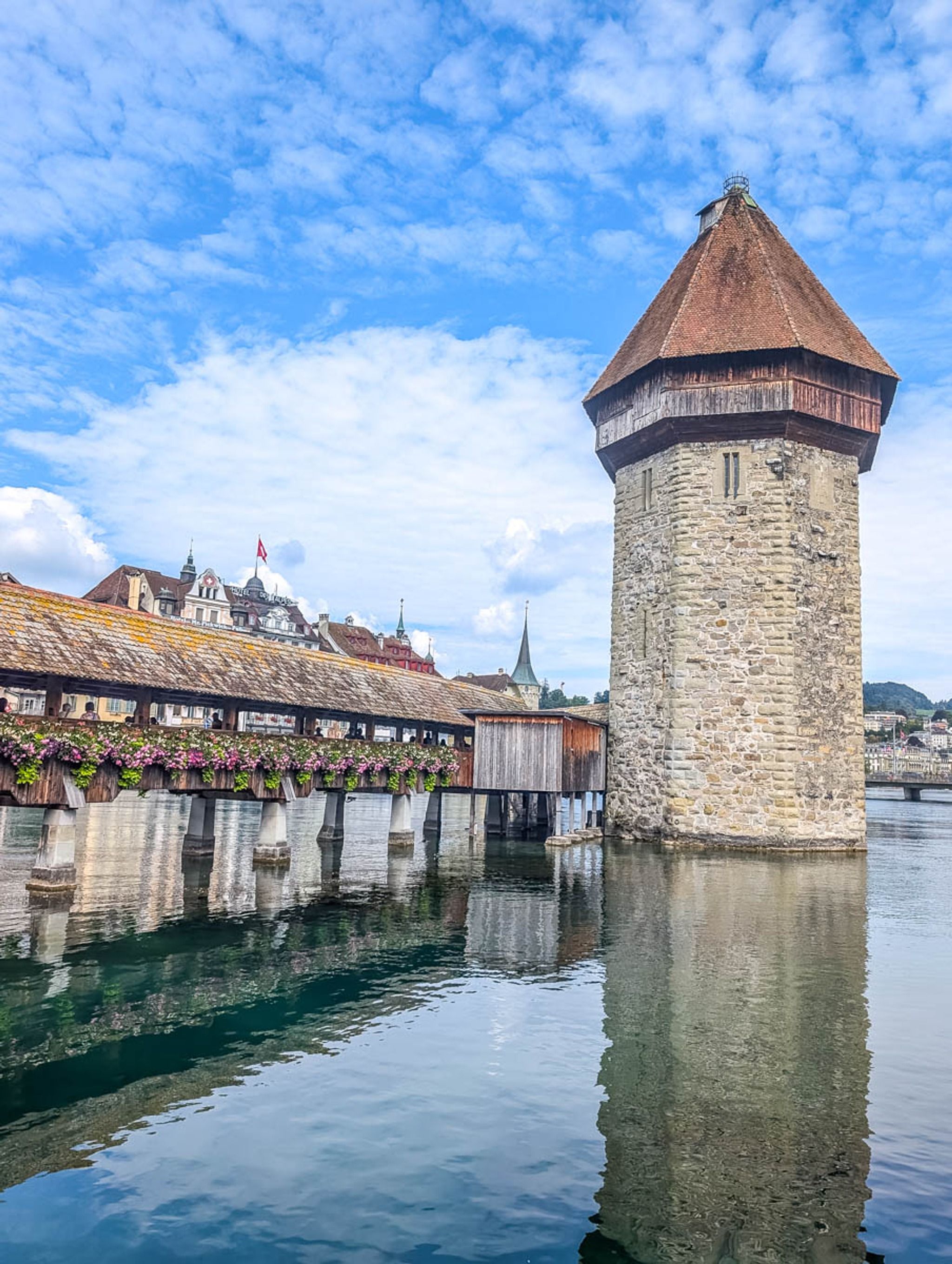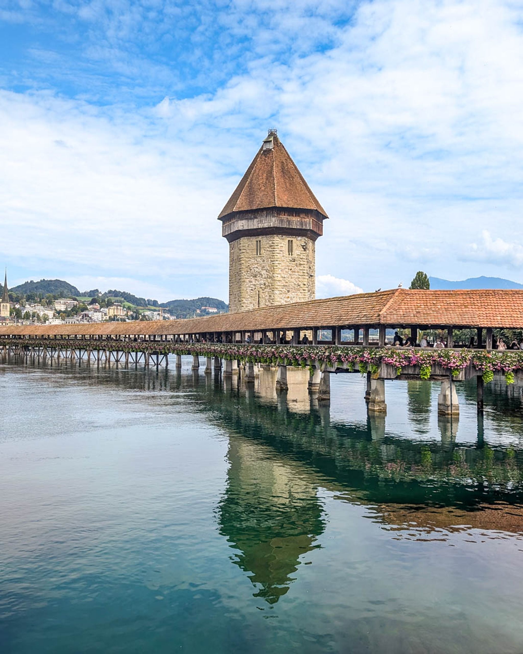 It's the most iconic photo spot in Lucerne, lined with beautiful flower boxes with a background of the charming cityscape. When you walk across, don't forget to look up at the triangle paintings on the roof beams, the main attraction.