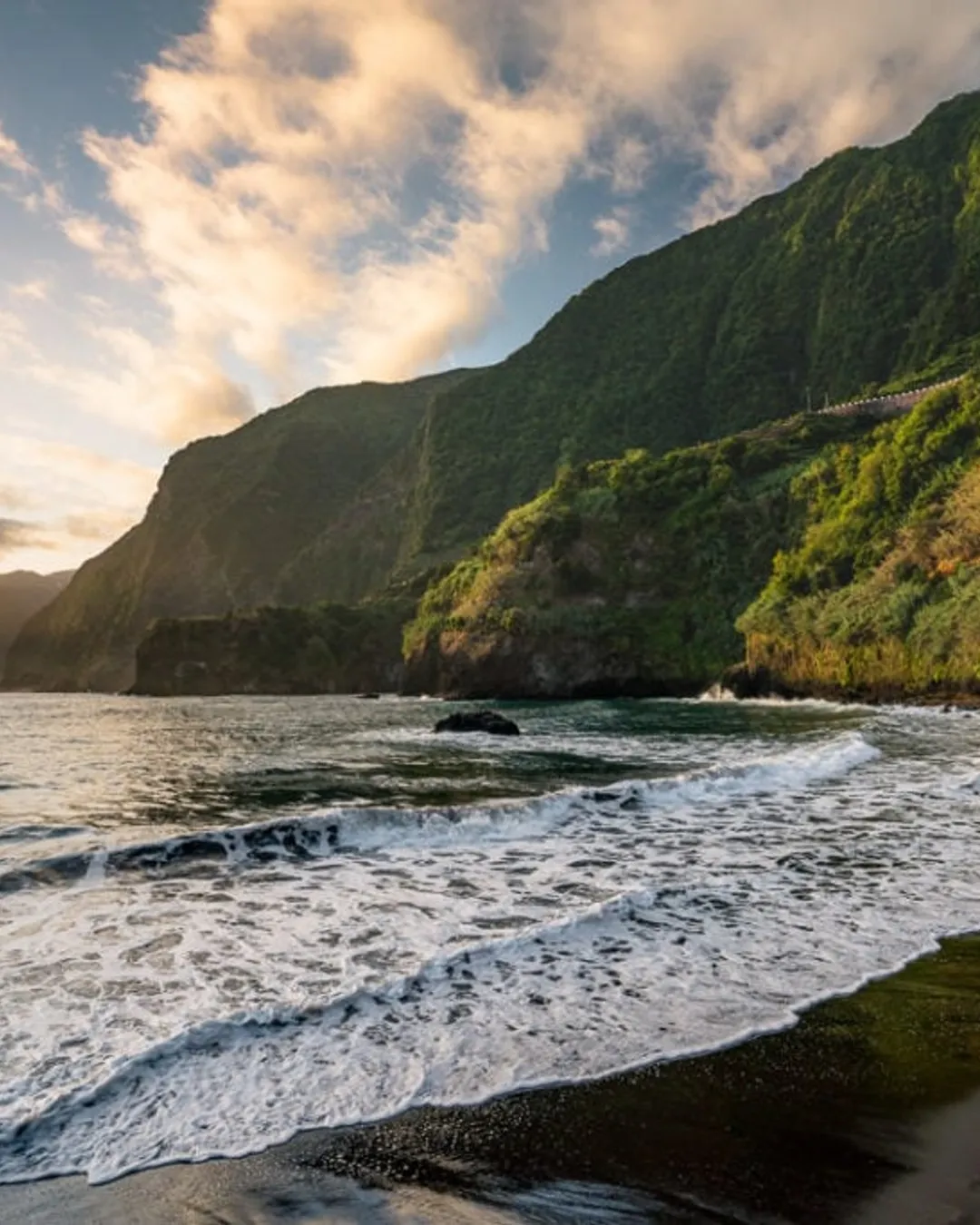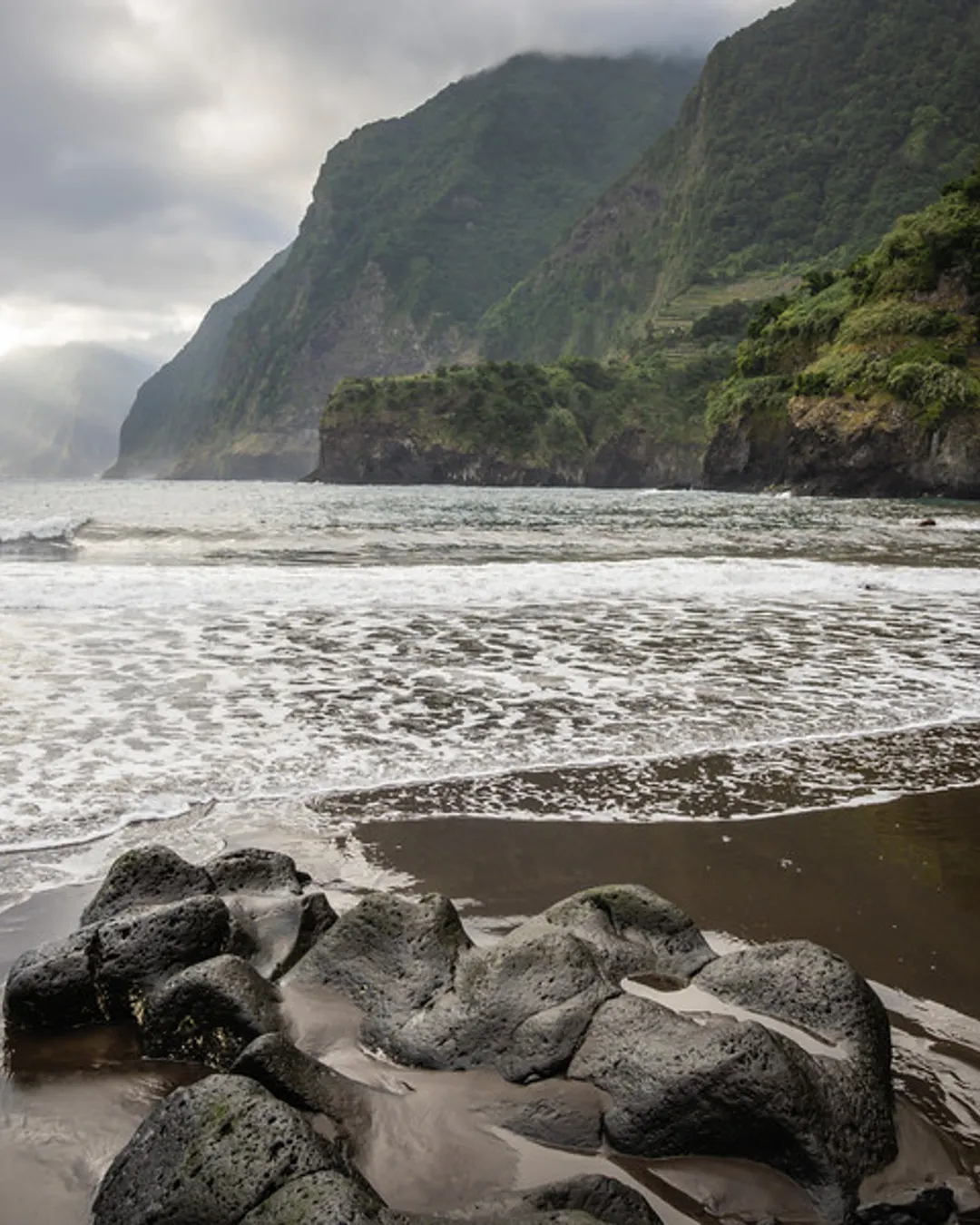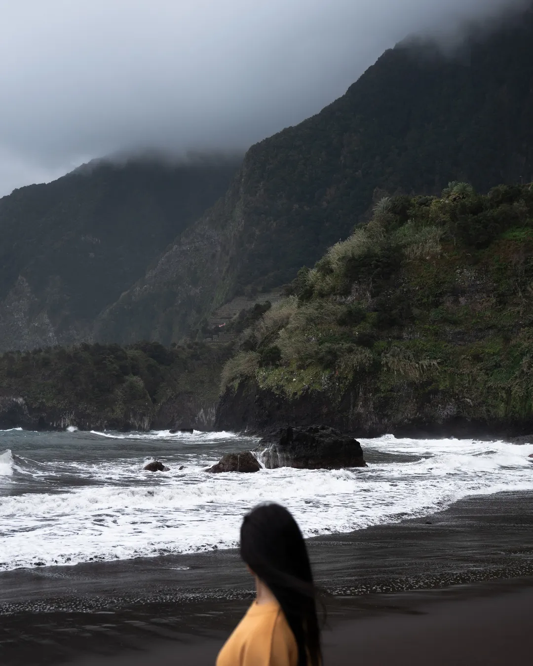 Black sand beach with dramatic cliff backdrop