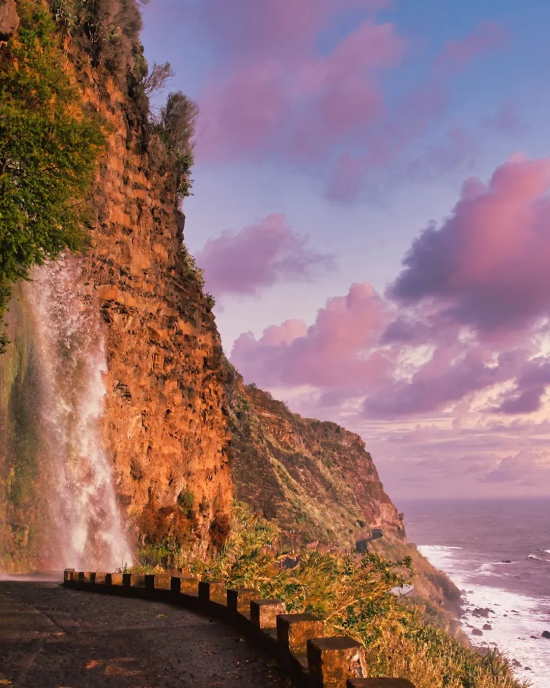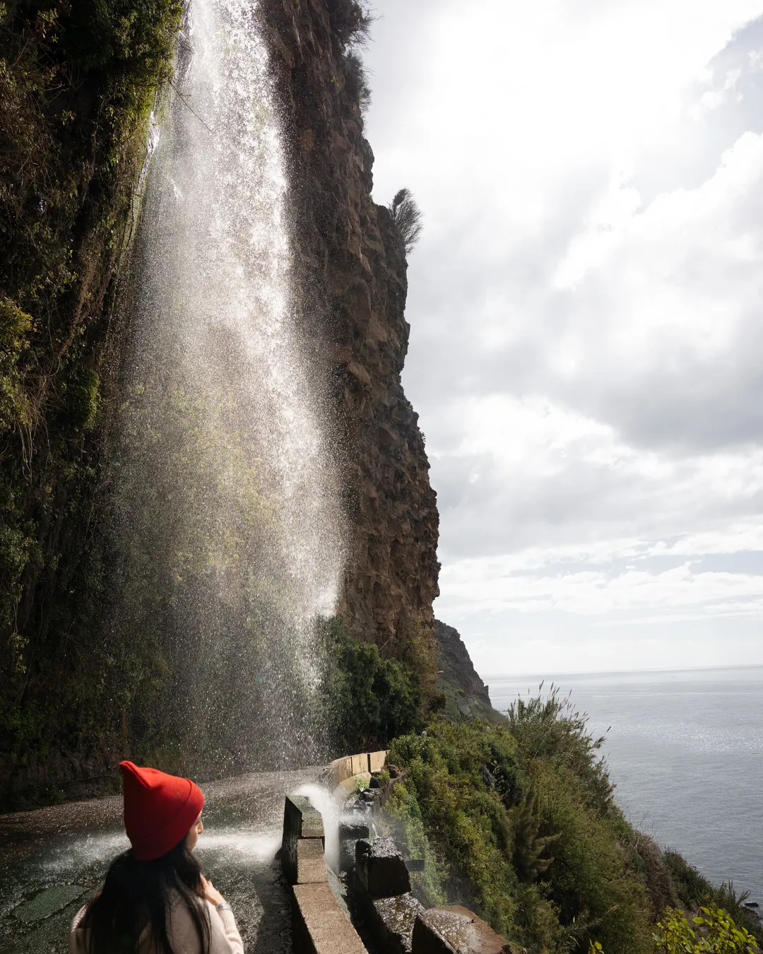 Roadside waterfall, ocean backdrop, unique photo.