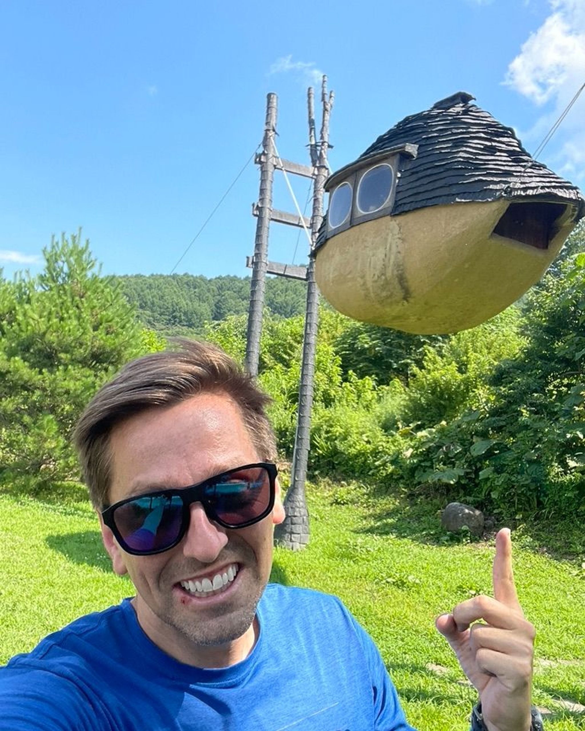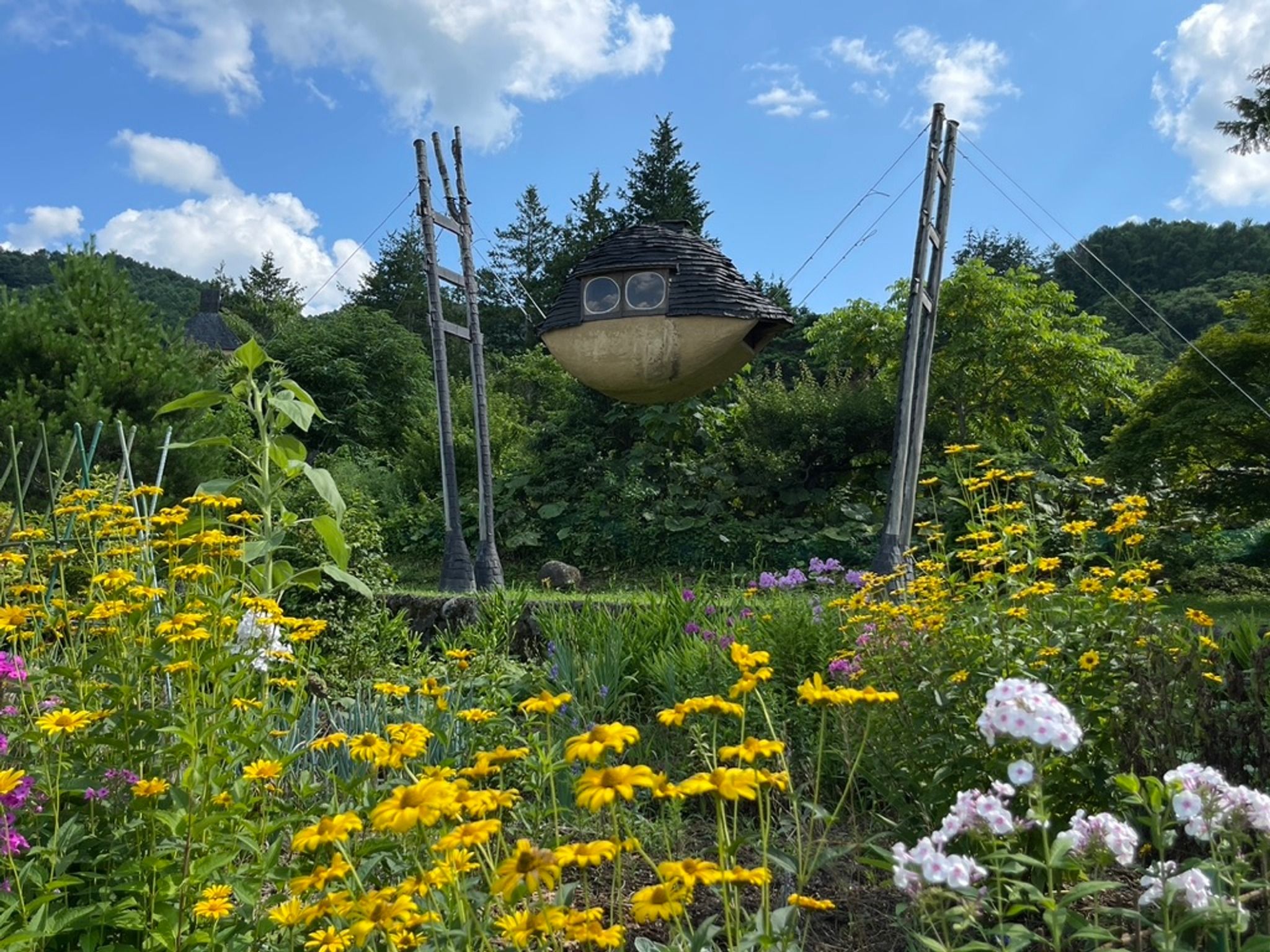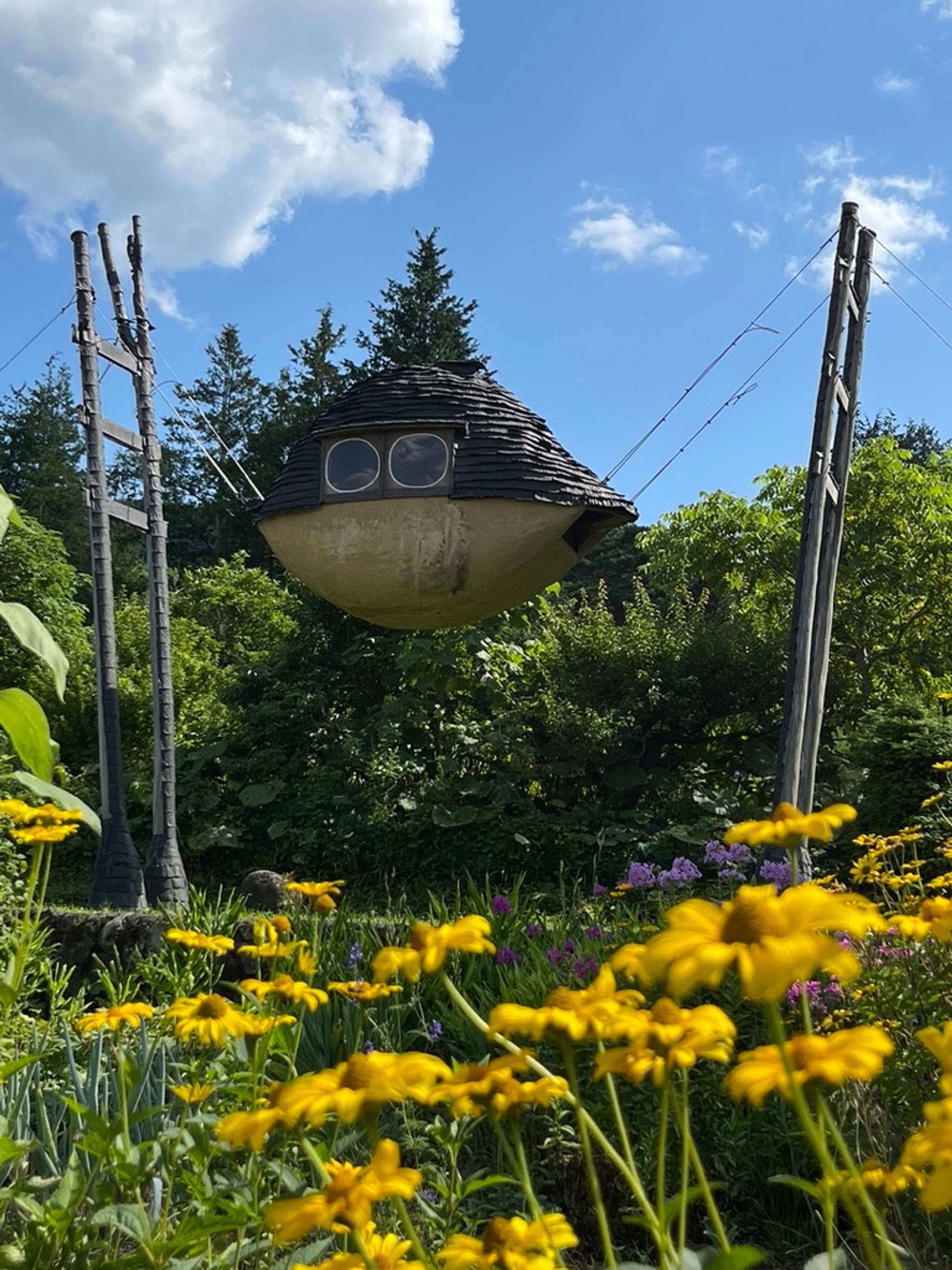 Terunobu Fujimori's "Flying Mud Boat" is a whimsical and surreal traveling tea house installation that resembles an acorn blown up to human scale. Suspended on tension cables over natural wooden posts, this unique structure features a shingle roof, yellow-painted mud plaster exterior, and circular windows for ventilation. With a cozy interior complete with a small stove and cedar planks, the design showcases Fujimori's use of organic materials and playful architectural style. Perfect for a few people to enjoy a cup of tea in a fantastical setting, the "Flying Mud Boat" is a quirky and charming addition to Fujimori's portfolio.
