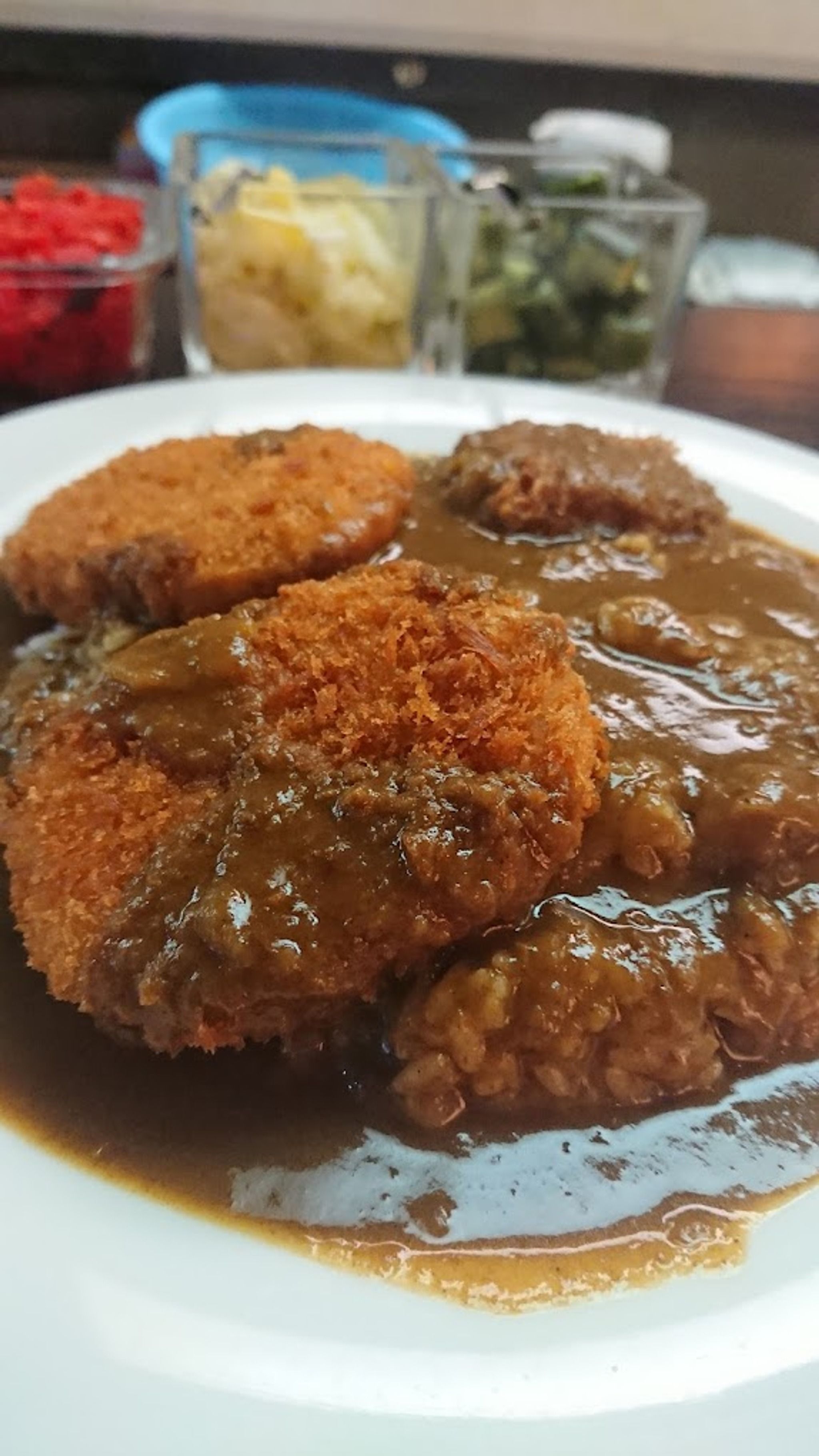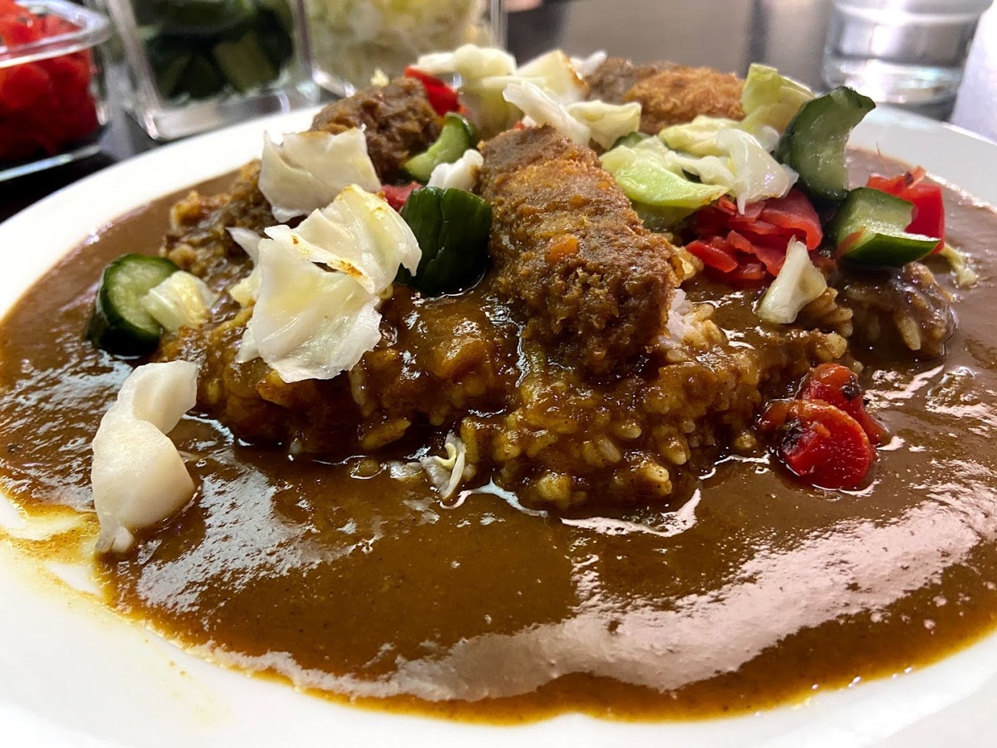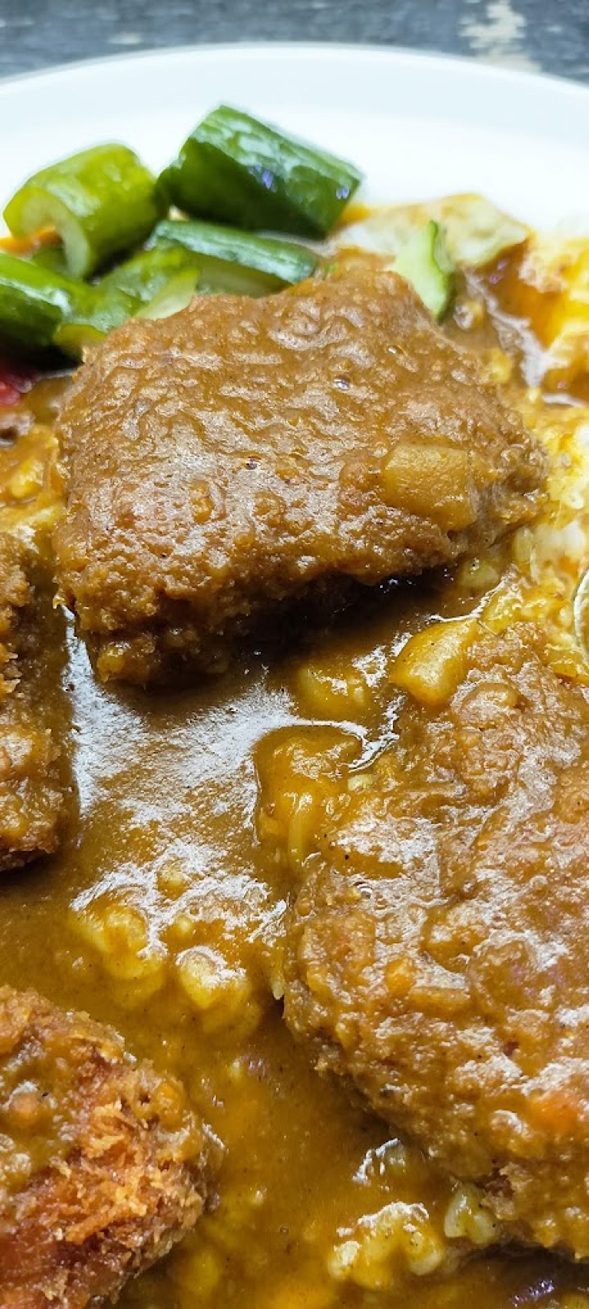 Locals describe the curry as being "European" but we still feel that the curry sauce is still a more Japanese style with Indian flavour whilst the croquettes & crumbed kushikatsu toppings are definitely Japanese.