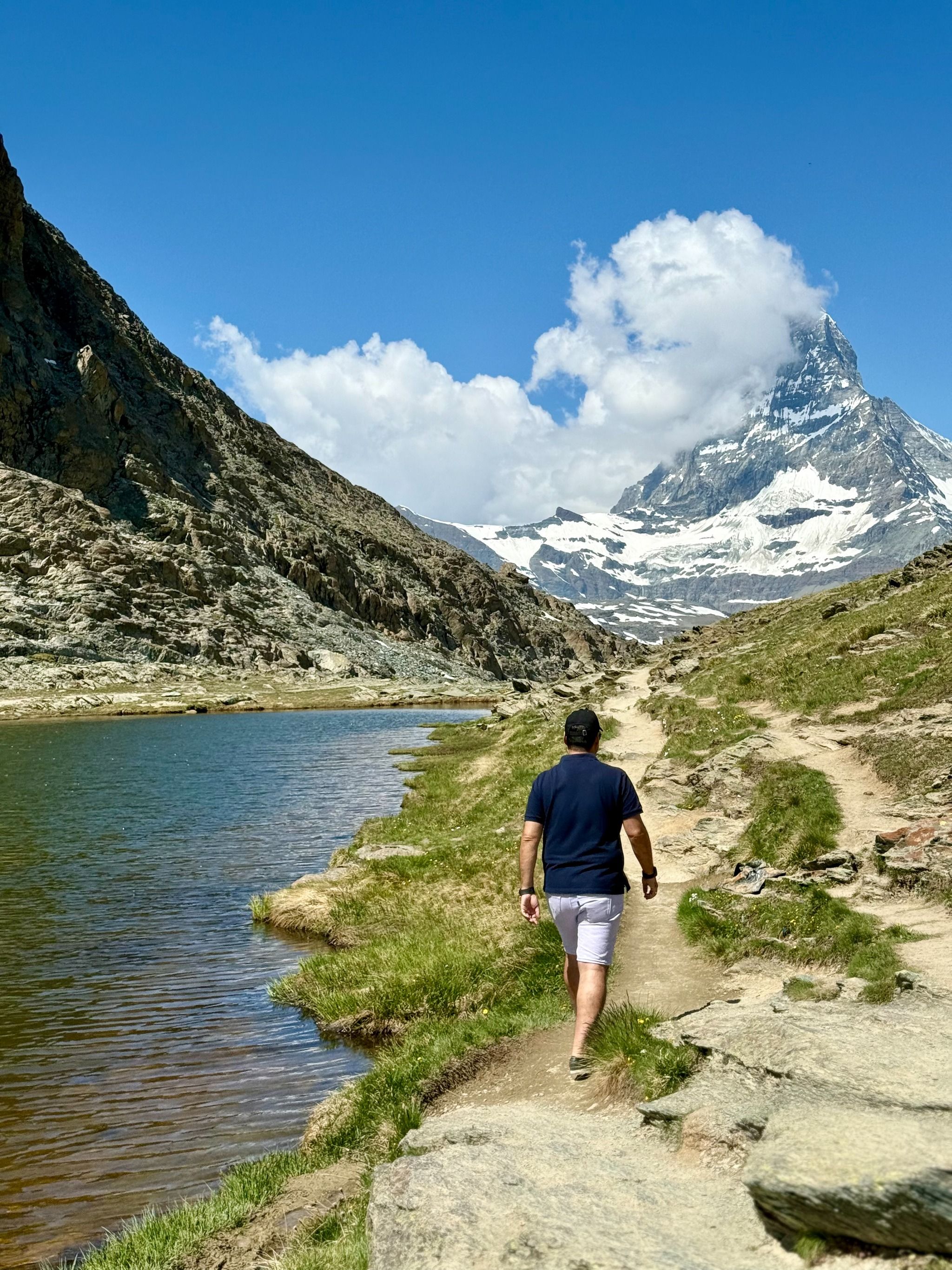 In the early morning or late evening when the wind is low, the lake becomes a perfect mirror, yielding that classic postcard shot of the Matterhorn double-peaked on the water’s surface. The trail is well-graded gravel and clearly signposted from Rotenboden.