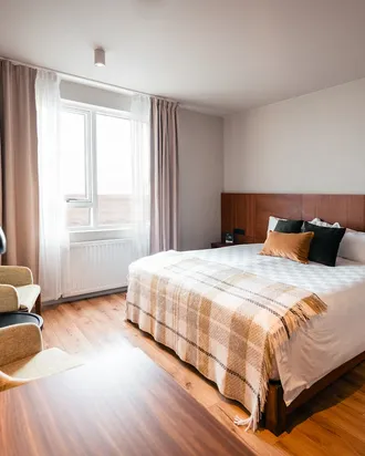 Umi Hotel in South Iceland offers 28 elegantly designed rooms with stunning views of the Westman Islands and the Southern Coast Line. Guests can choose from double or twin rooms, each equipped with private bathrooms and free WiFi. The hotel's bar provides a cozy spot to unwind with a drink while taking in the breathtaking scenery of Eyjafjallajökull. Complimentary breakfast buffet is included with every room, making it a perfect base for exploring the Icelandic countryside.