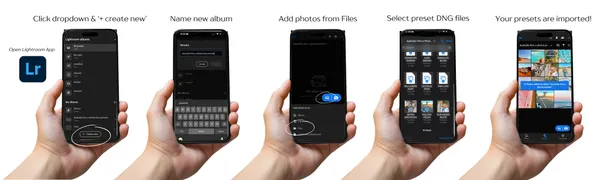 Open the Lightroom Mobile App and go to the ‘Edits’ homescreen (middle of the bottom menu bar). Tap the top-left dropdown 'All photos' or ‘Recents’ and click the '+ create new' (bottom middle button) to create a new album & name it 'Australia thru a phone lens presets'.