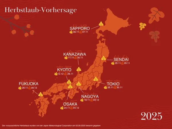 Am 02. September veröffentlichte die Japan Meteorological Corporation die erste Ausgabe der offiziellen Herbstlaubvorhersage 2025. JMC schätzt dabei die besten Beobachtungszeiträume für die roten Blätter (Ahornbäume) und gelben Blätter (Ginkgobäume) im ganzen Land – von Hokkaido bis Kagoshima.