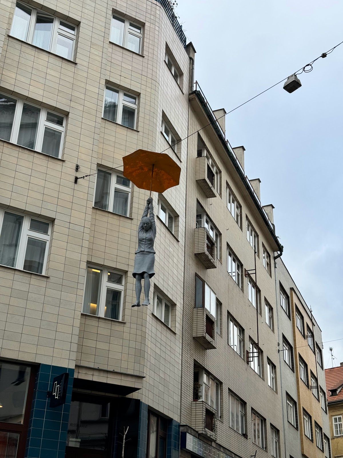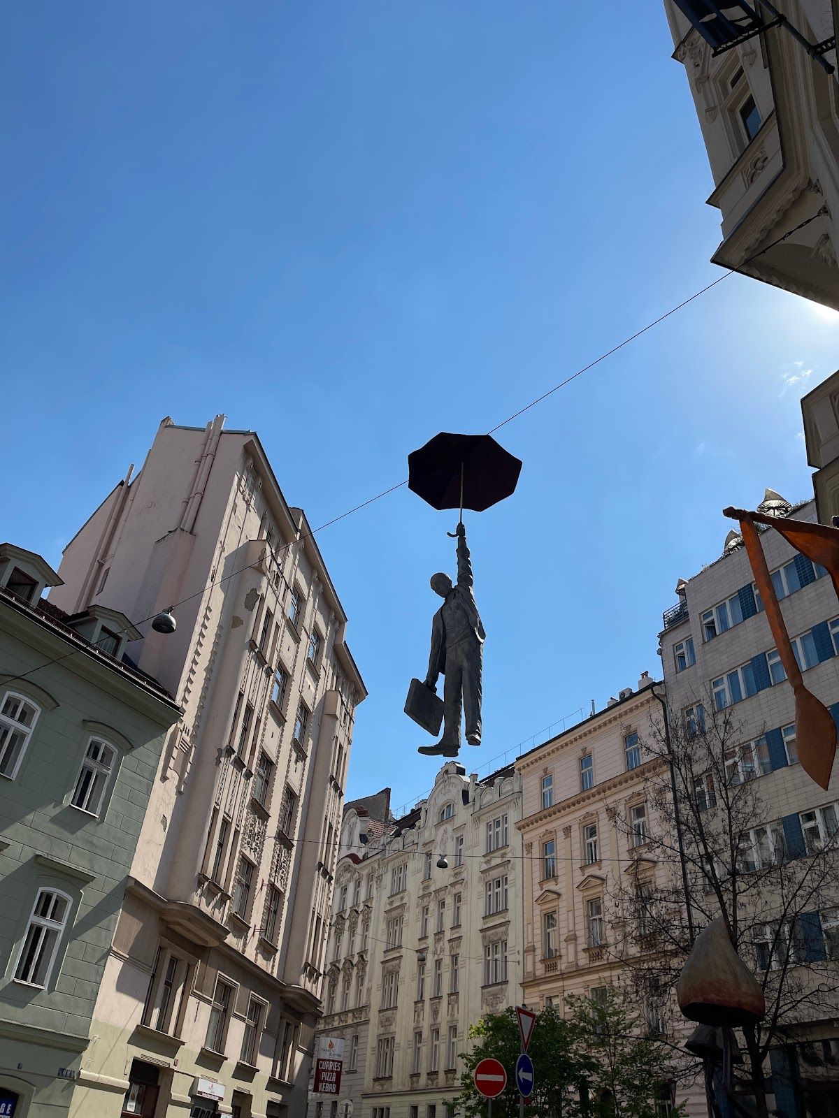 Whimsical couple floating with umbrellas