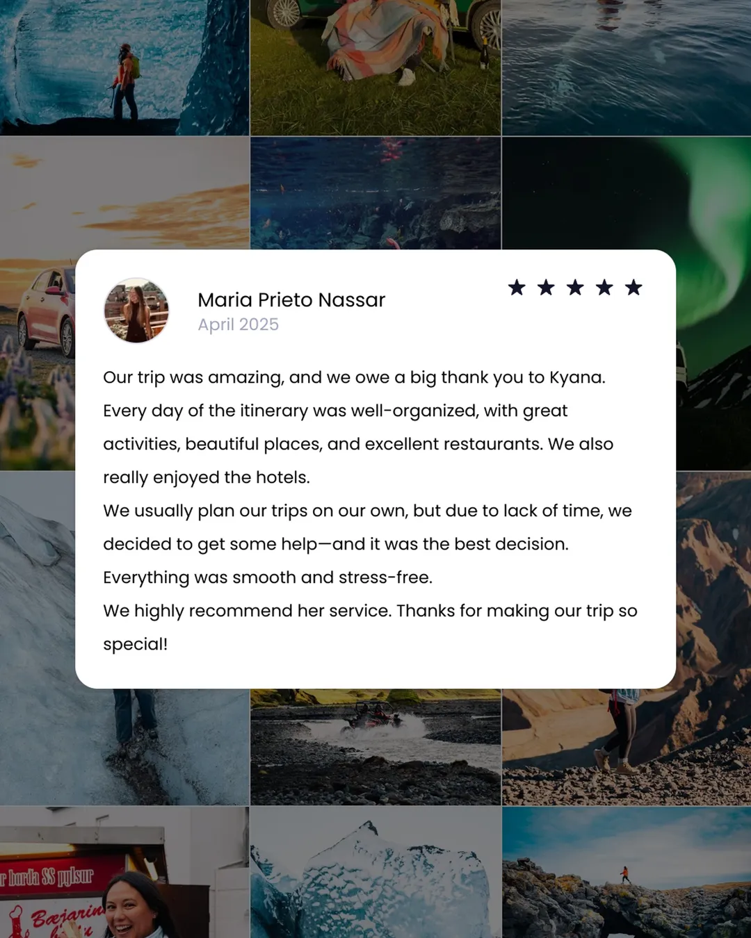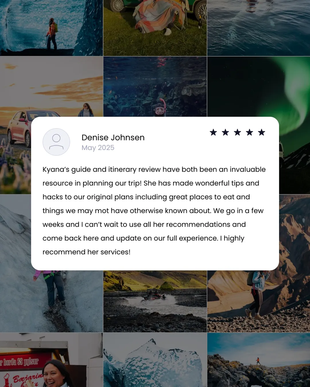 🚙 After I learn about your travel style and expectations, I'll put together a full itinerary that is perfect for you or your group! I'll include my suggestions on where to stay, what to do, which tours to book and when, restaurants you shouldn't miss, and all kinds of daily travel tips so you feel like I'm right there with you!