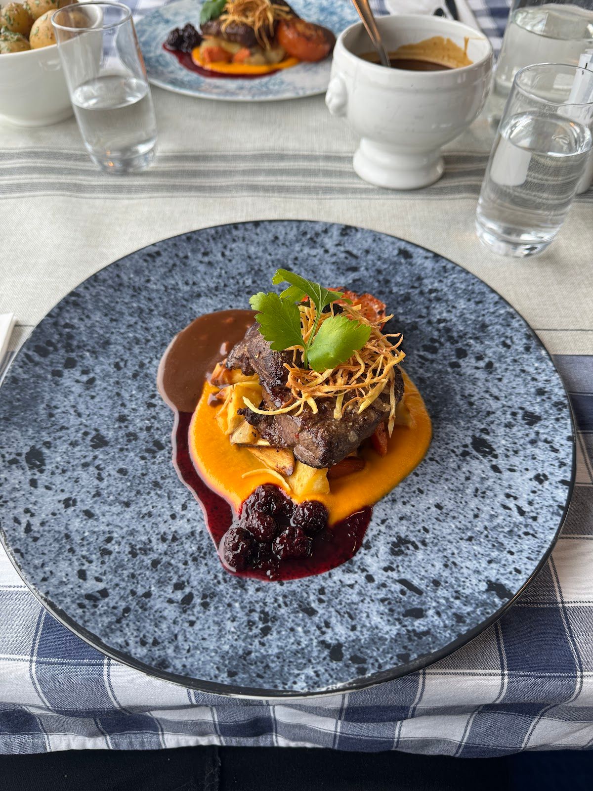 Signature dishes include fish, game meats, and hearty stews.