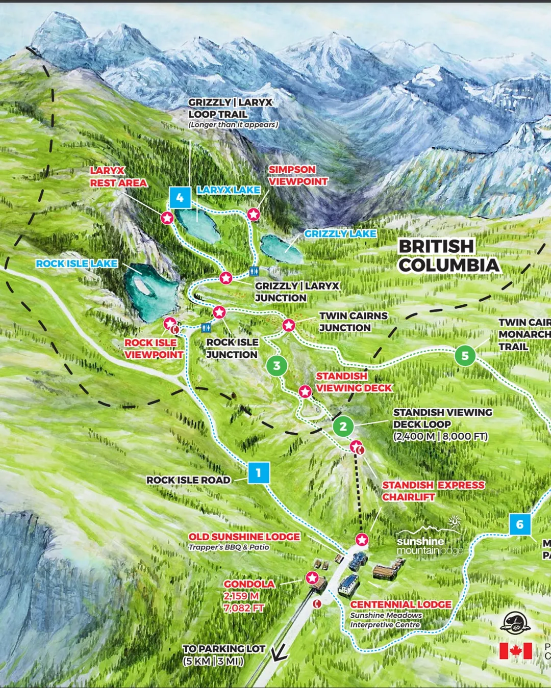 Once at the top, there are plenty of trails to choose from. The grizzly/laryx trail has the most photo opportunities and takes roughly 2 hours. View trail map here.