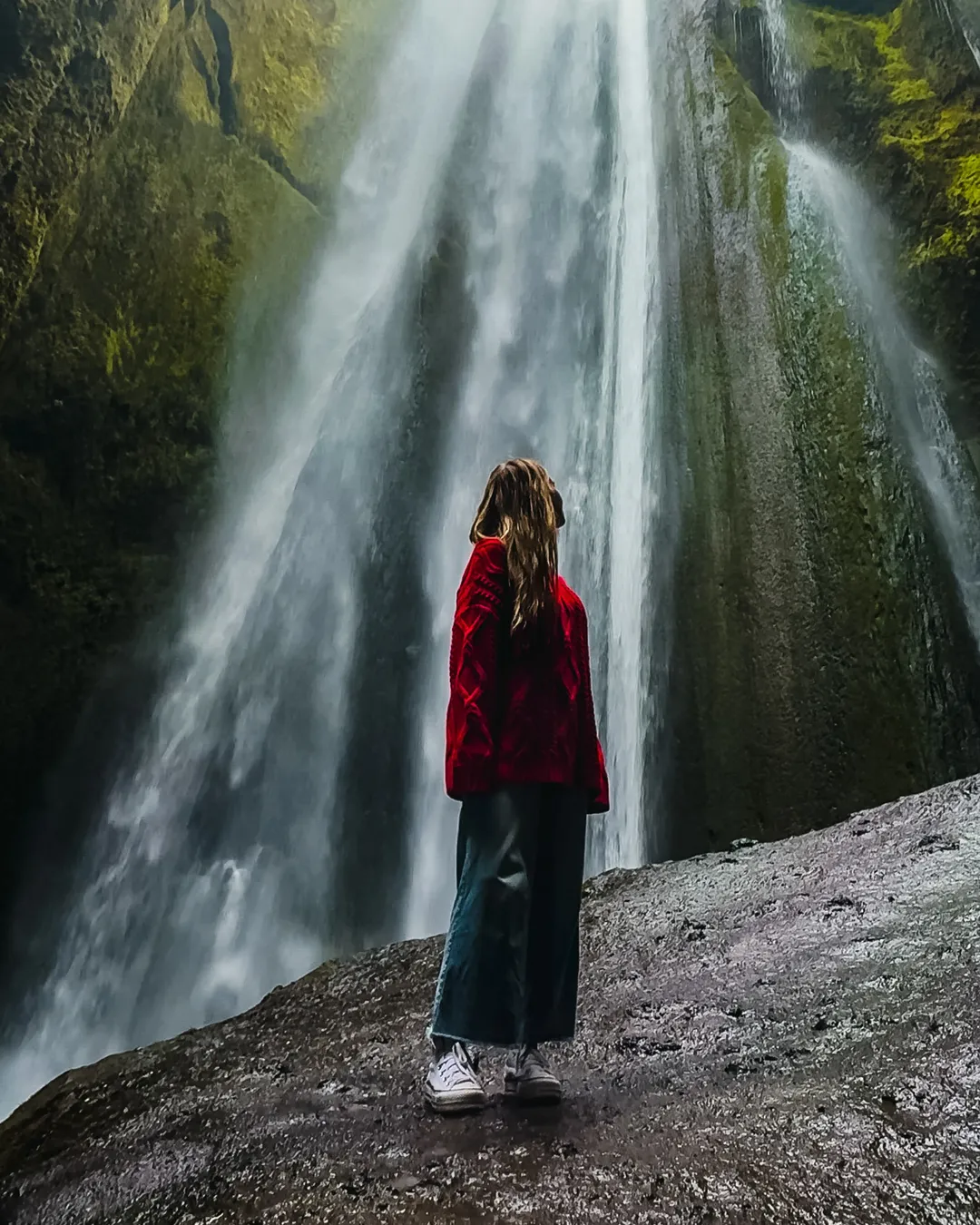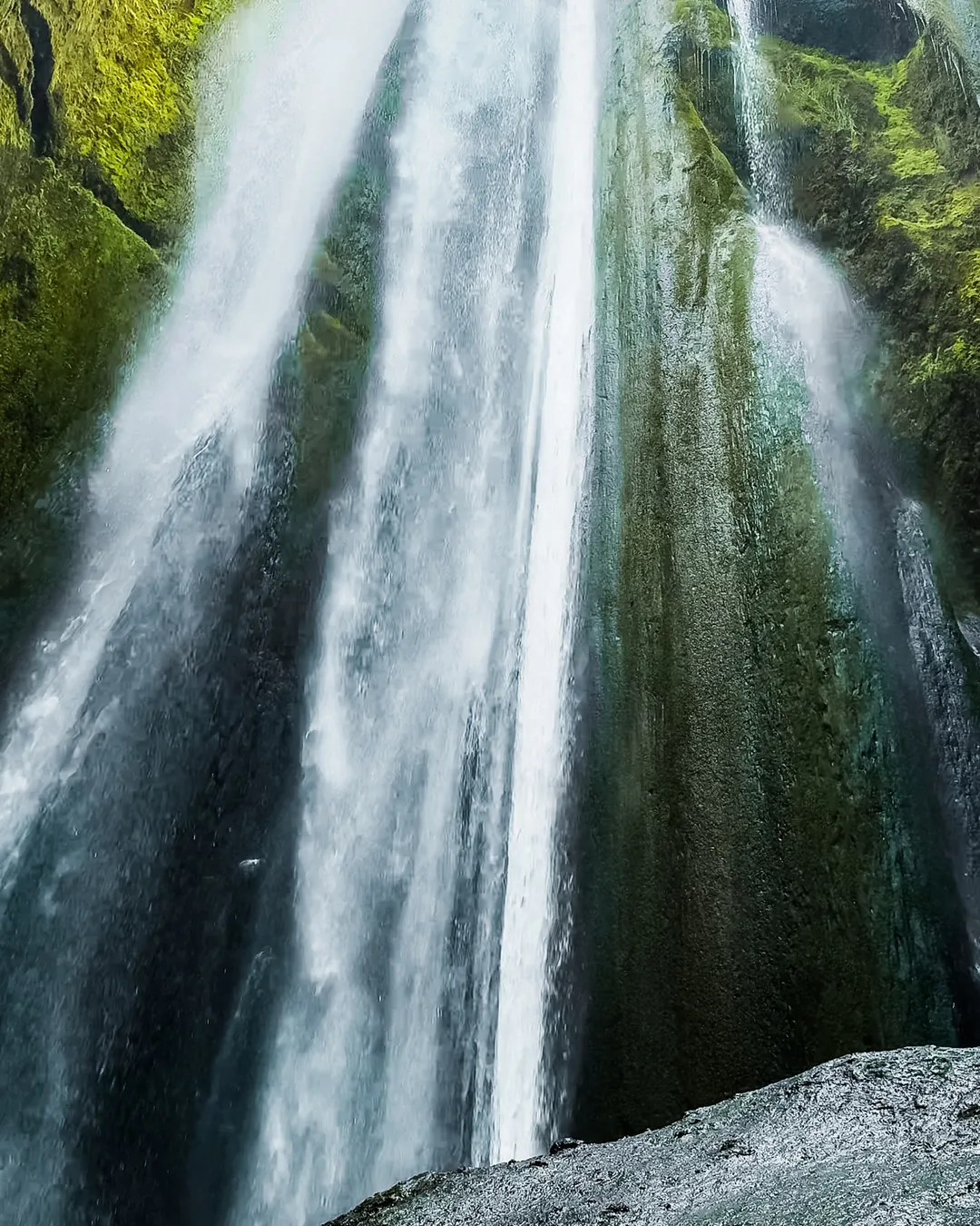 There's a boulder inside of the canyon right below the waterfall, climb on top (be careful because it's very slippery) and angle your camera up towards the top of the gorge. Example in the photo above!! :)