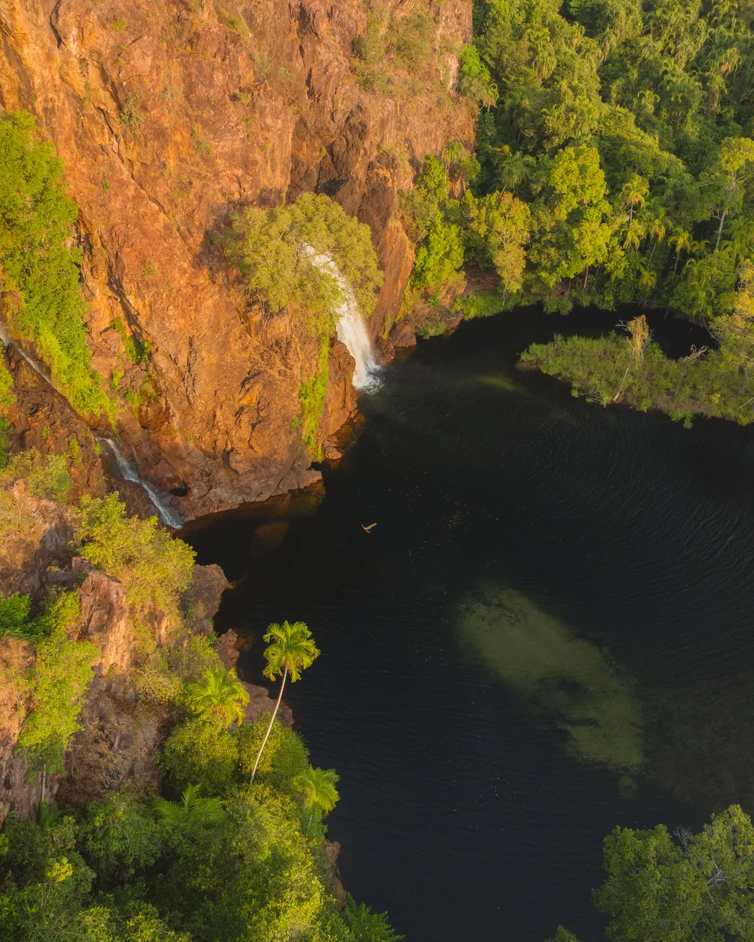 Wangi Falls is one of the most iconic and popular spots in Litchfield National Park. This stunning double waterfall flows year-round and is surrounded by lush greenery and towering cliffs. The swimming hole is deep, and the perfect place to cool off in the Top End heat. At sunset, the cliffs catch the warm glow of golden hour, making it feel even more magical.