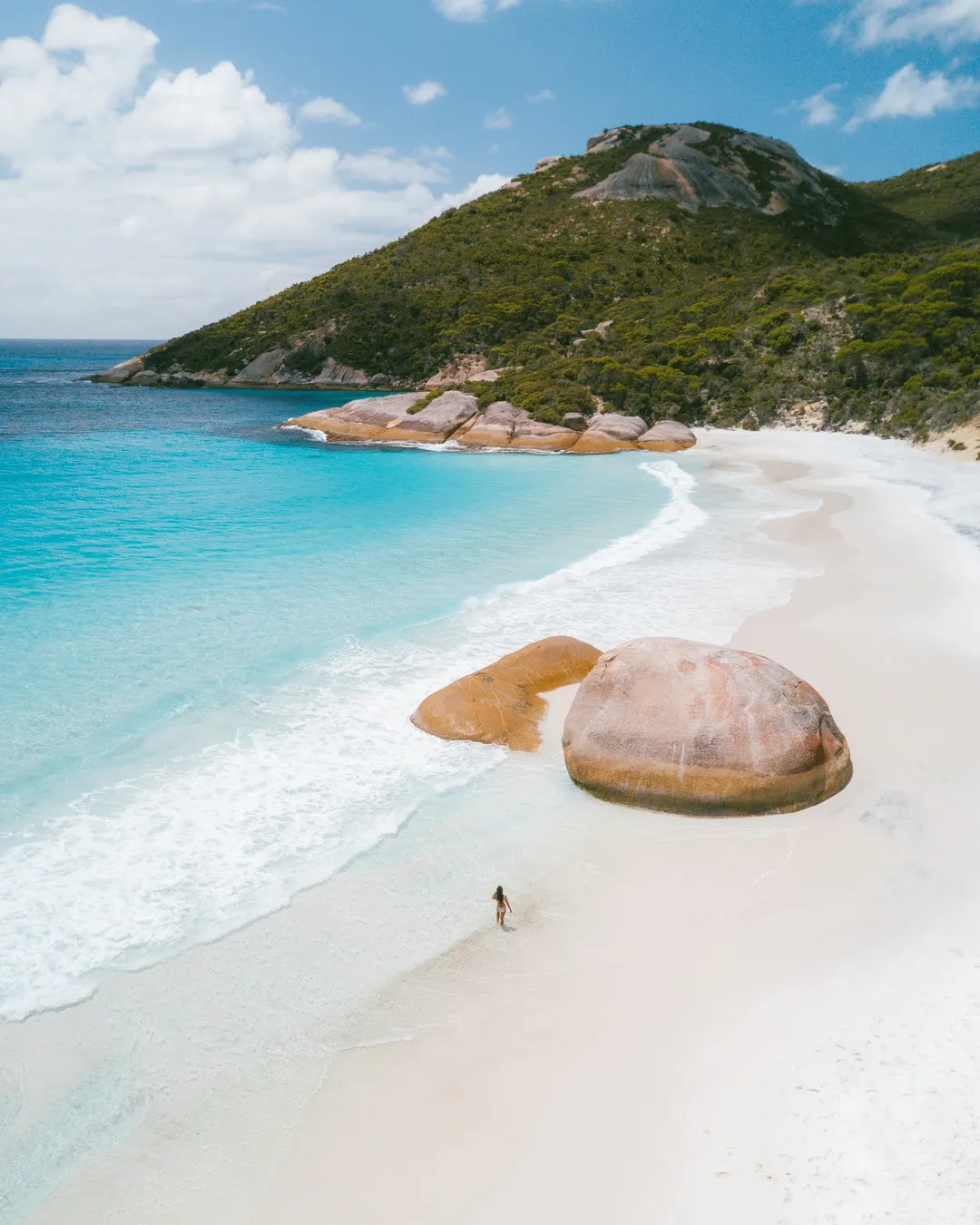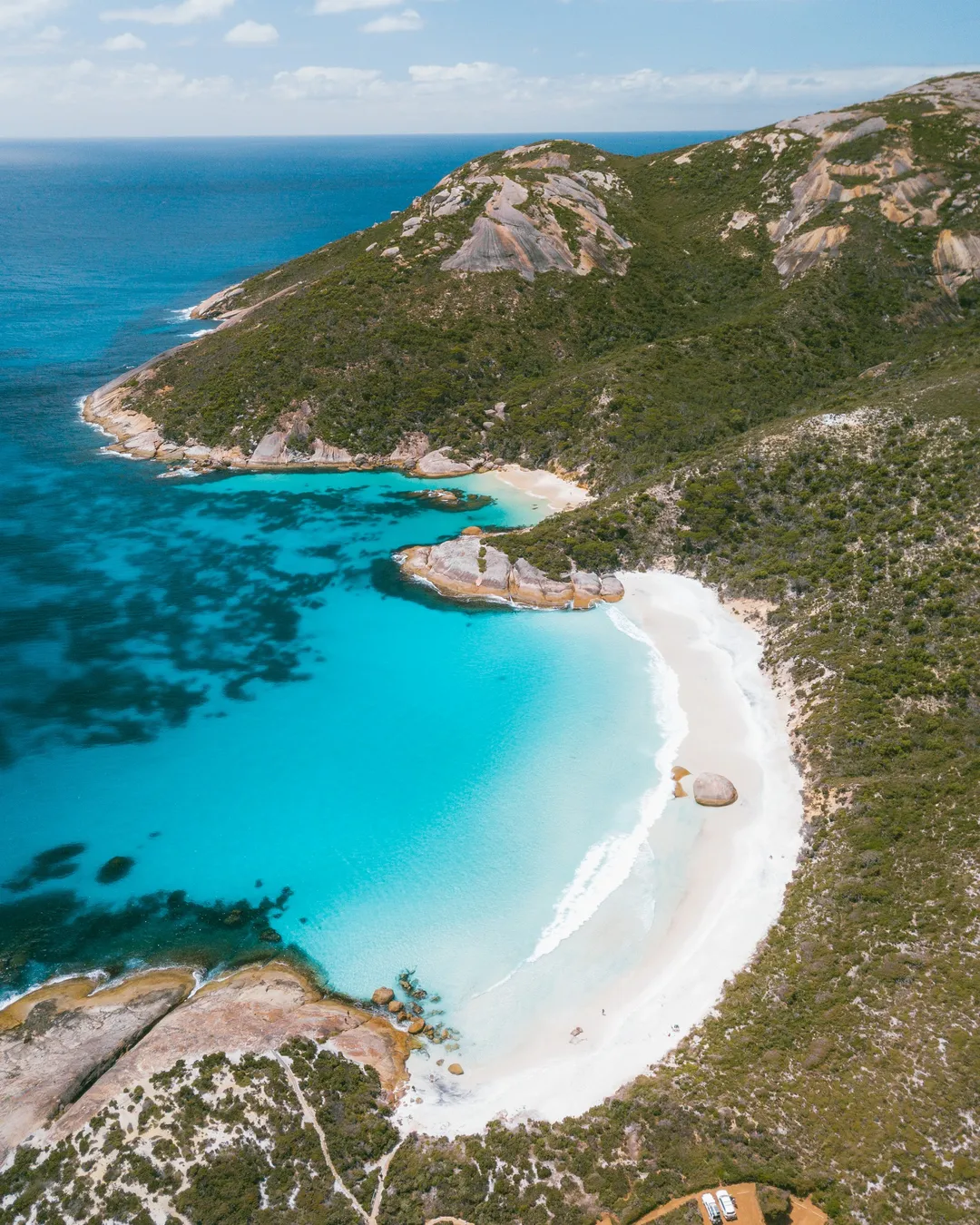 Little Beach is the most iconic beach in Albany and also one of the best. It's known for turquoise waters, soft white sand, and picture perfect views. One of our favourite things about this beach are the two unique granite boulders along the waters edge. They capture perfectly with a drone at sunrise and our photo from here is still one of our favourites today.