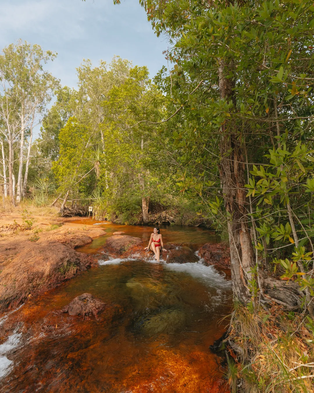 Buley Rockhole is the perfect spot to cool off and unwind in Litchfield National Park. A flowing stream of water trickles down into a series of natural rock pools, creating peaceful little swimming holes tucked between the red rocks. The water is super clear and refreshing, and the warm reds of the surrounding rocks make it feel like an outback oasis.