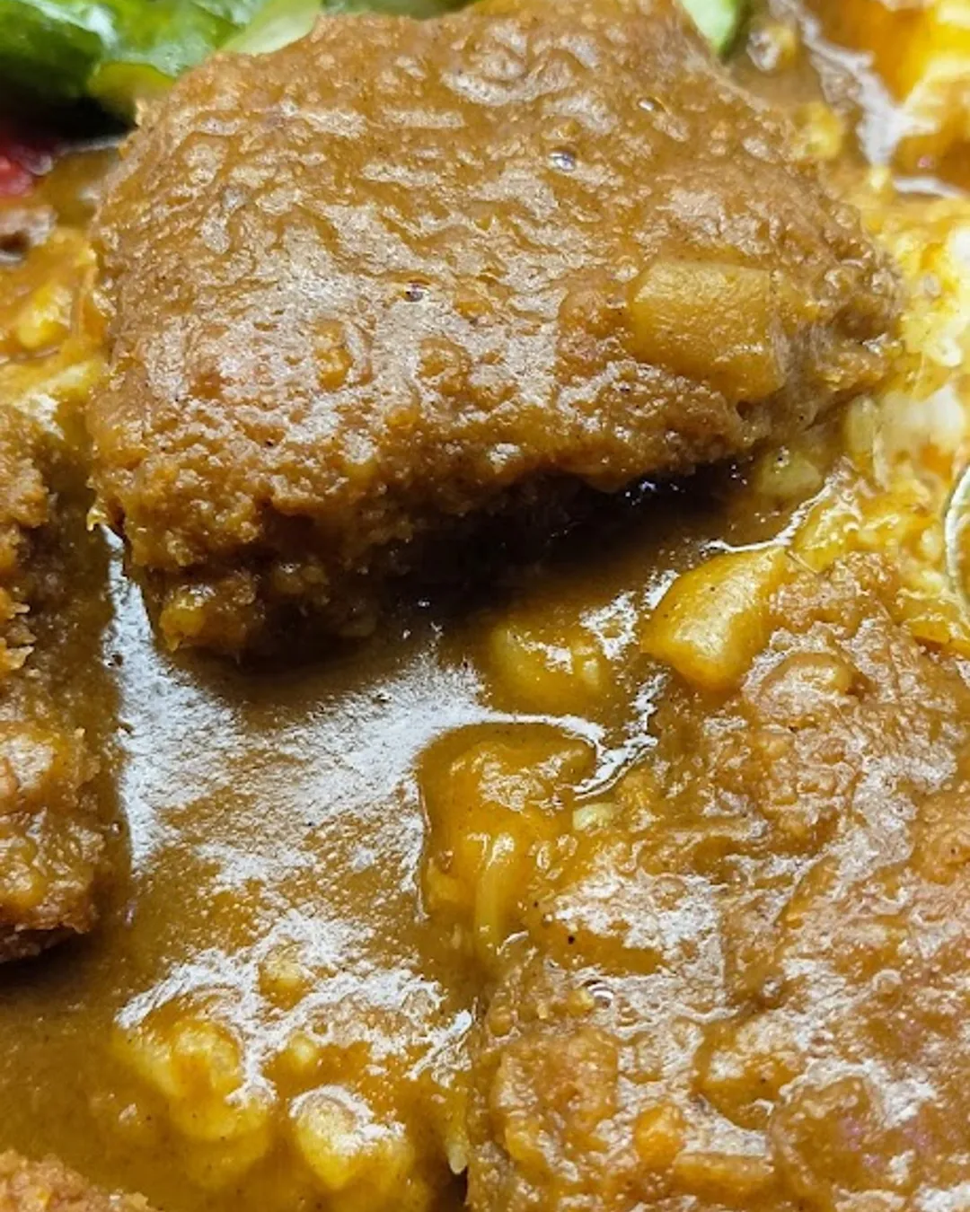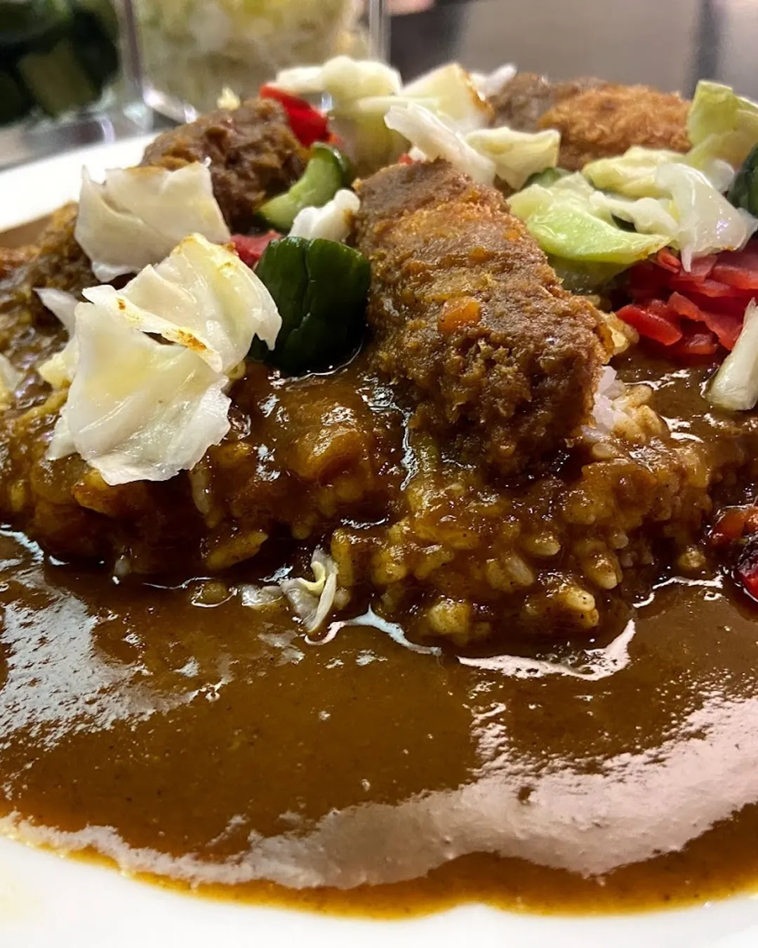 You will be pleasantly surprised how tender the beef is and how the toppings stay crispy. The cabbage and pickles are self serve and are the perfect accompaniment to the curry. Be sure to also