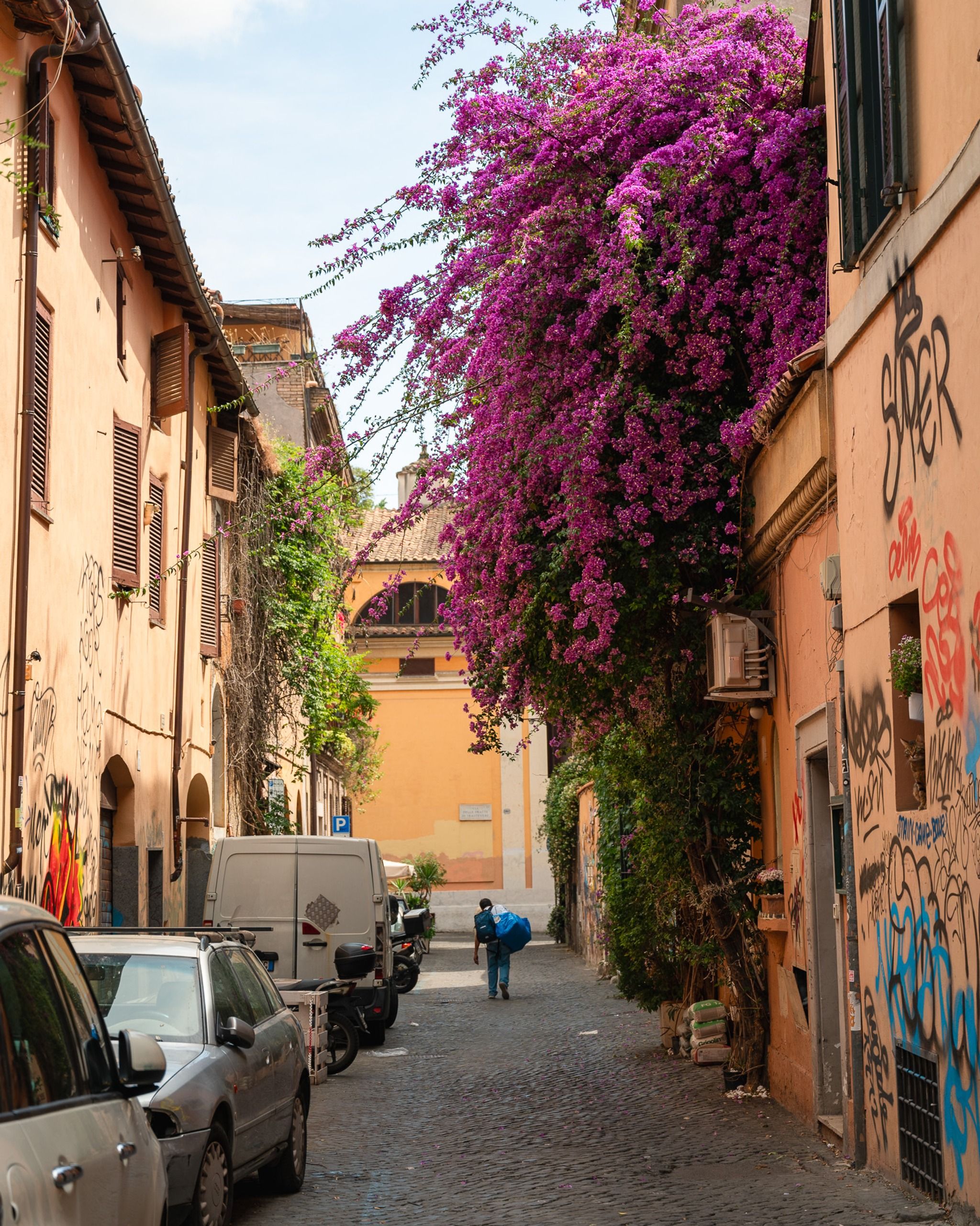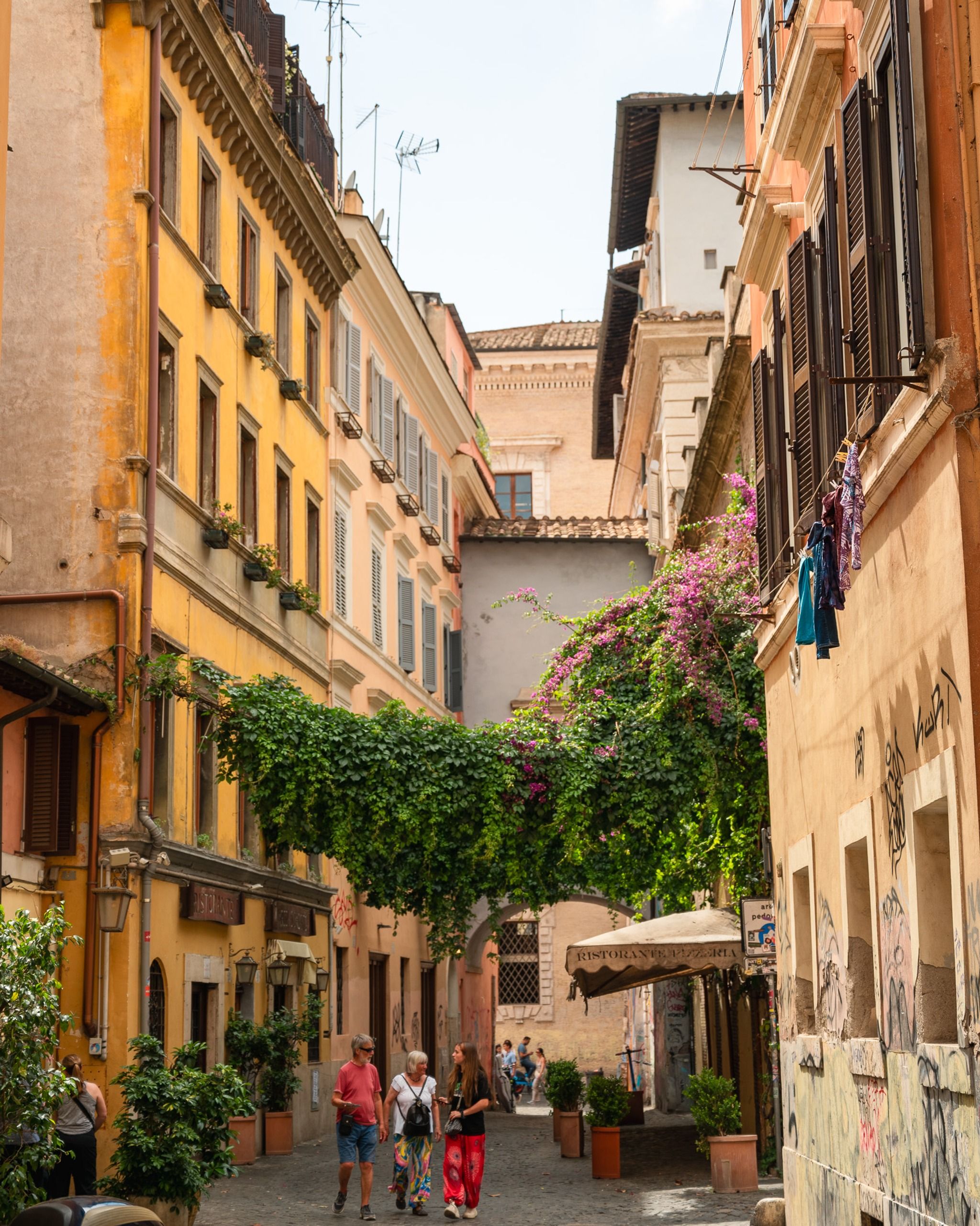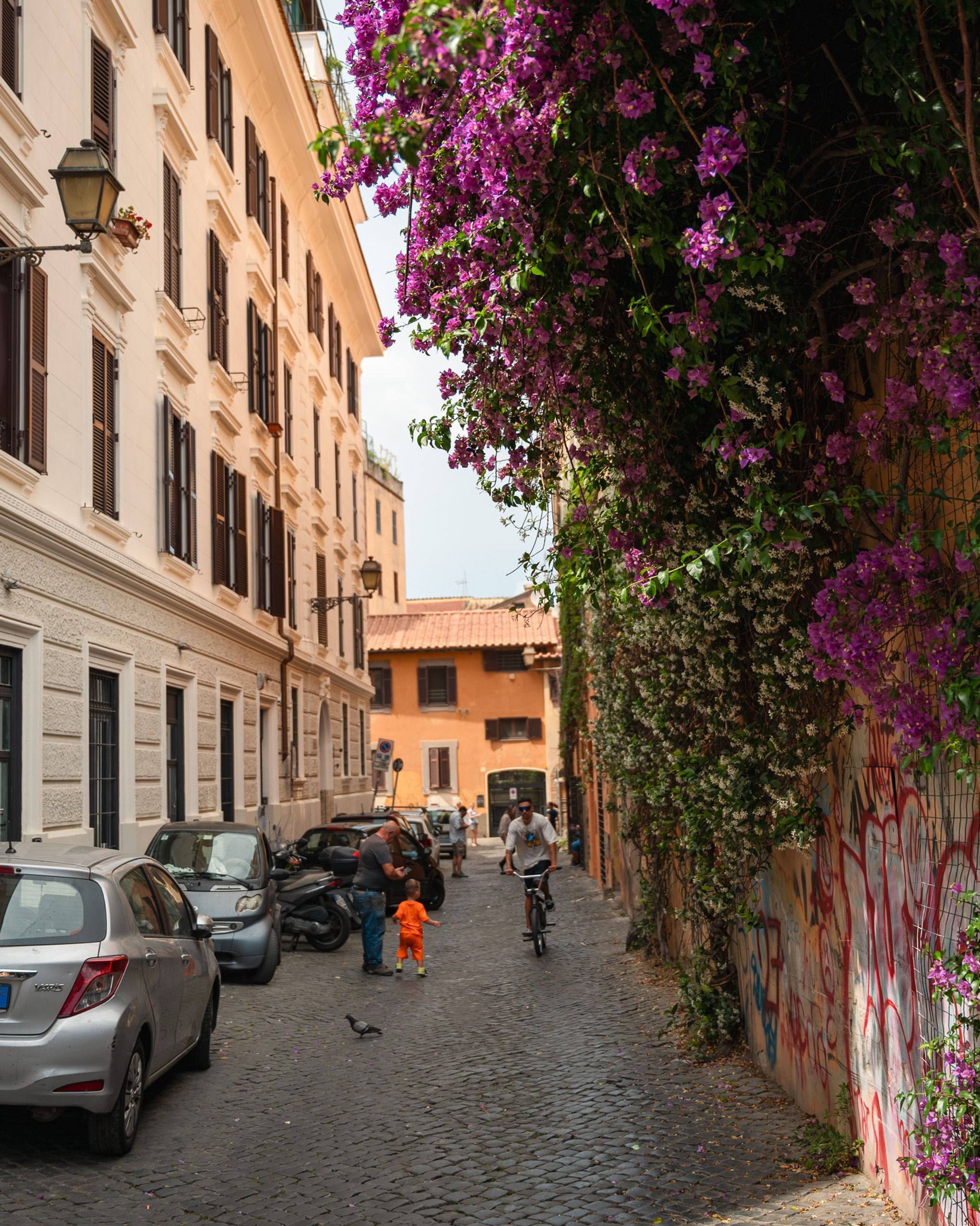 I really enjoy strolling through its characteristic narrow streets and discovering new corners of this beautiful area. On the map, I've marked some of my favorites, just to give you an idea of which direction to head. I've often visited this area in June when the bougainvillea is in bloom, enhancing the beauty of the area with its intense fuchsia color. I highly recommend Trastevere as a place to stay; there are countless things to do, and it's perfect for evening outings.