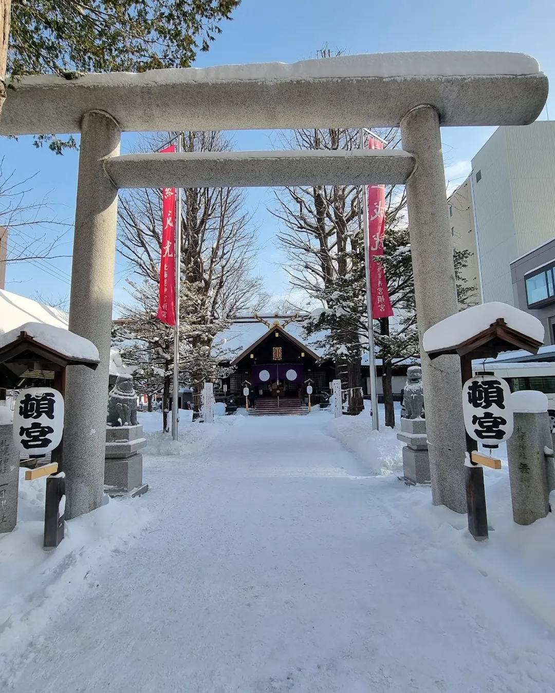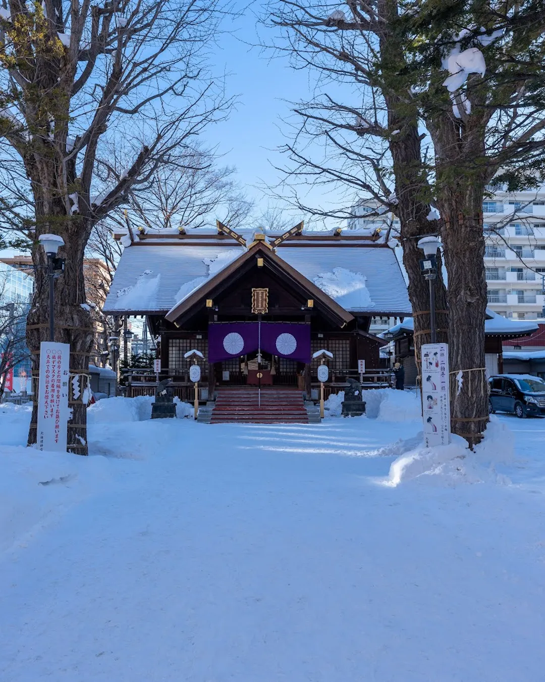 A long tree-lined path leads to the main hall, where visitors cleanse their hands at the temizuya fountain before offering prayers. The architecture is elegant and traditional, with wooden beams glowing softly against the forest backdrop — simple yet deeply serene. In spring, the grounds transform into one of Sapporo’s best cherry blossom spots, while in winter the snow-covered torii gates create an almost magical silence.