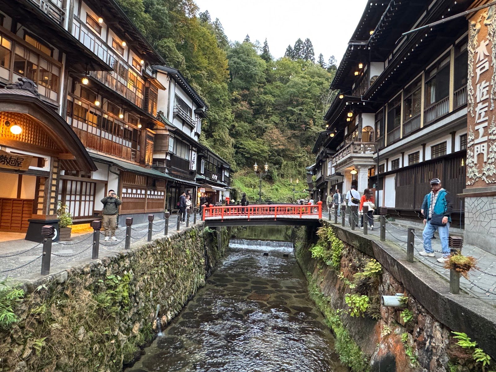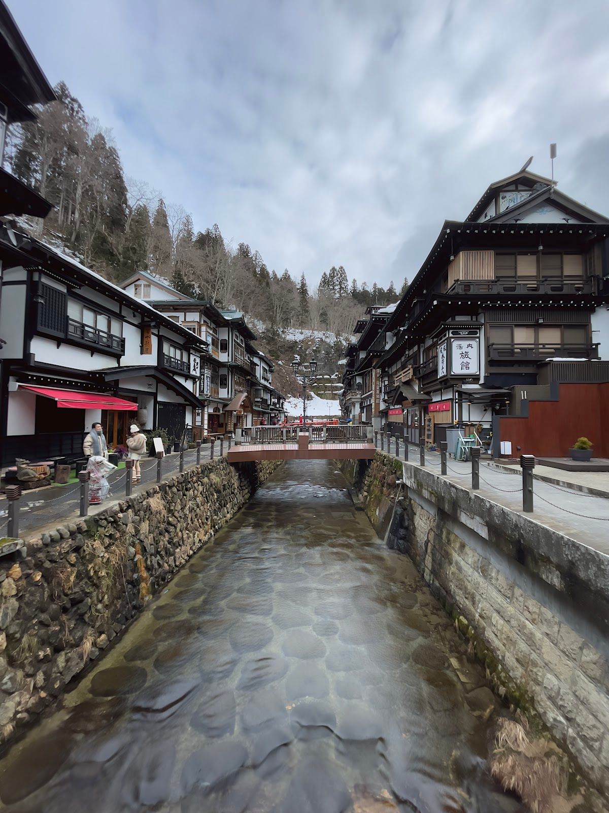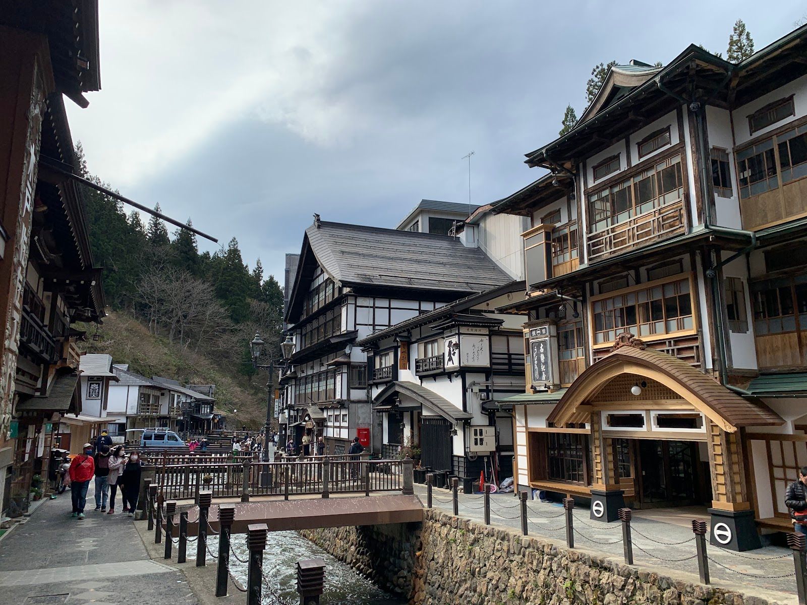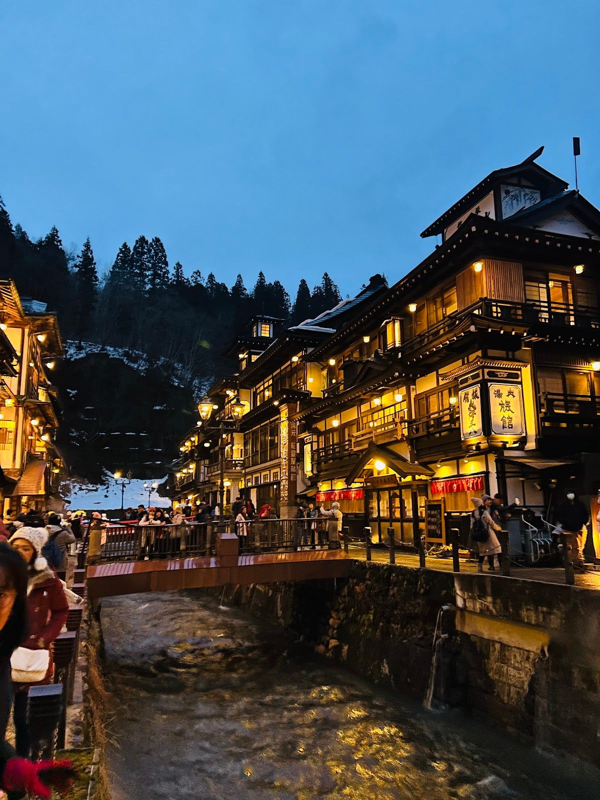 Ginzan Onsen est une ville thermale traditionnelle située dans la préfecture de Yamagata, réputée pour son architecture préservée datant de l'ère Taishō. La ville s'est développée autour de l'exploitation minière de l'argent au XVIIe siècle avant de devenir une destination thermale. Une rivière étroite traverse le centre-ville, bordée de ryokans en bois dotés de balcons et de lampes à gaz qui s'allument le soir. L'atmosphère est particulièrement unique en hiver, lorsque les bâtiments sont recouverts de neige. Les visiteurs peuvent se promener le long de la rivière, profiter des bains de pieds publics ou passer la nuit dans un ryokan pour accéder aux bains privés. Les visiteurs à la journée peuvent également accéder à certains bains publics, mais la plupart des ryokans réservent l'accès aux bains à leurs clients.